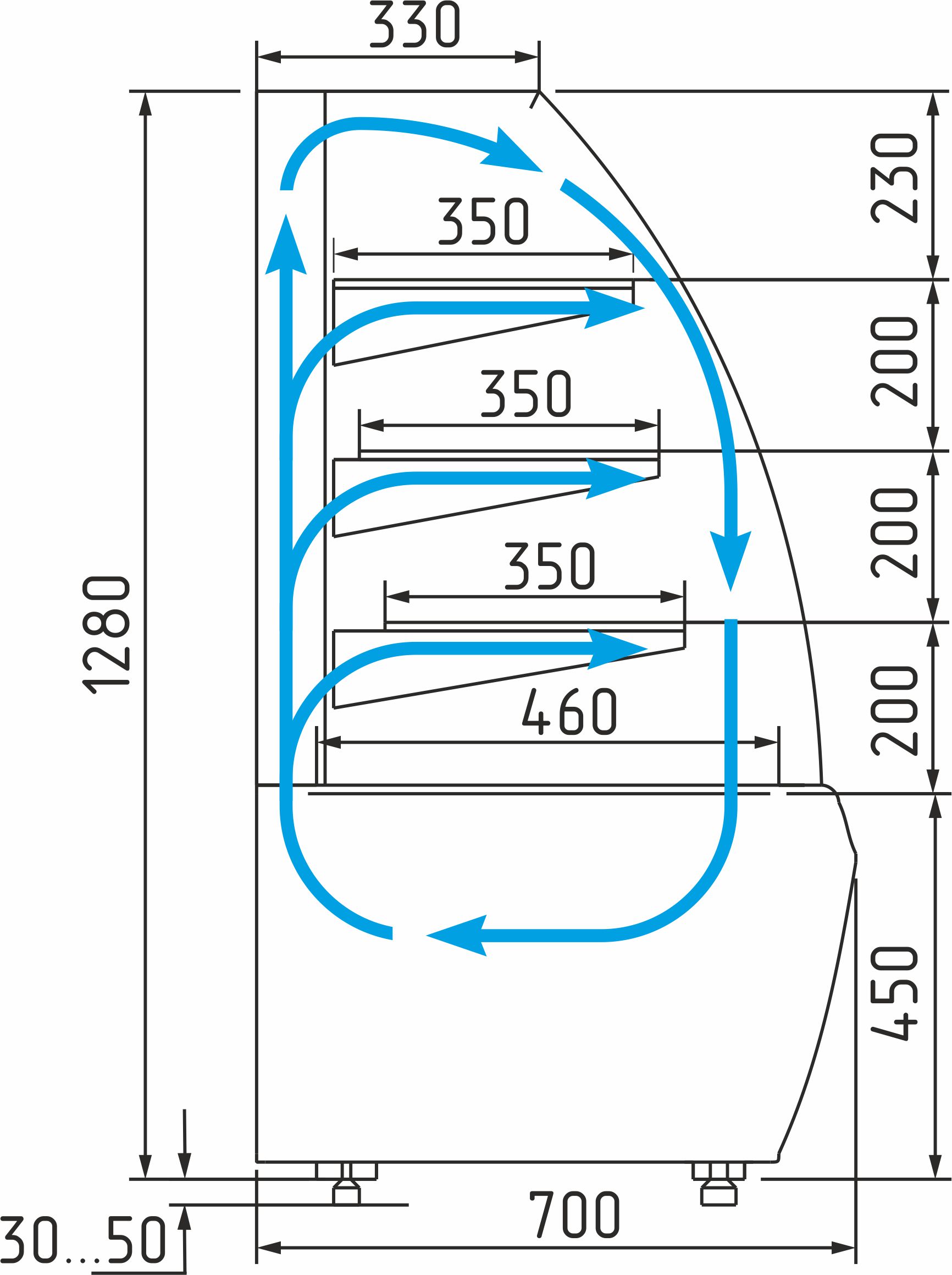 Кондитерская витрина Carboma K70 VV 0,9-1 Standard 9005-0430 используется на предприятиях общественного питания и торговли для демонстрации, охлаждения и кратковременного хранения тортов, пирожных и других кондитерских изделий. Модель оснащена панорамным сферическим передним стеклопакетом и прямыми боковыми стеклопакетами. Корпус выполнен из стали, боковины - из металла толщиной 2,5 мм, раздвижные задние створки на роликах - из стеклопакета, термоизоляция корпуса - из пенополиуретана.