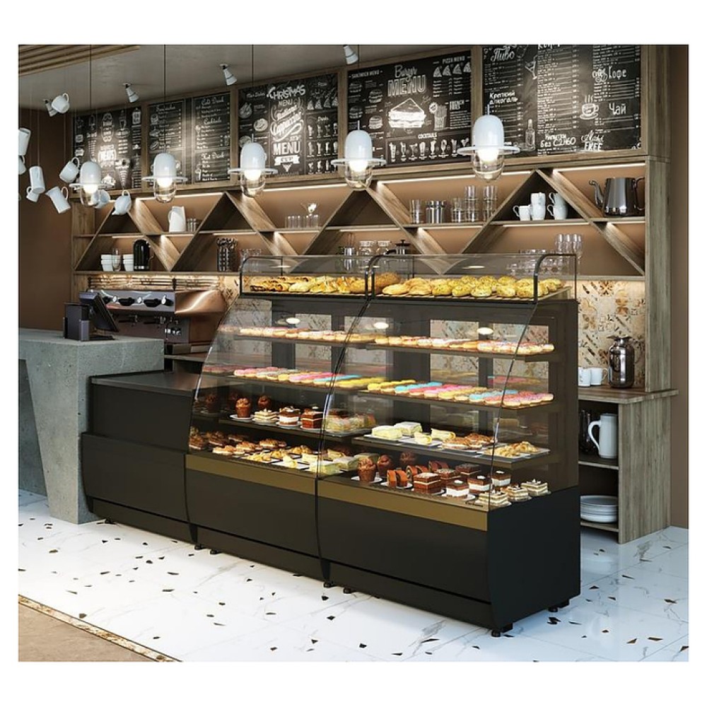 Угловая кондитерская витрина Carboma K70 VV-3 Standard версия 2.0 используется на предприятиях общественного питания и торговли для демонстрации, охлаждения и кратковременного хранения тортов, пирожных и других кондитерских изделий. Модель оснащена гнутым фронтальным стеклом и боковыми прямыми стеклами без металлических рамок, обеспечивающими улучшенный обзор продукции, и задними створками-слайдерами со встроенной ручкой.
