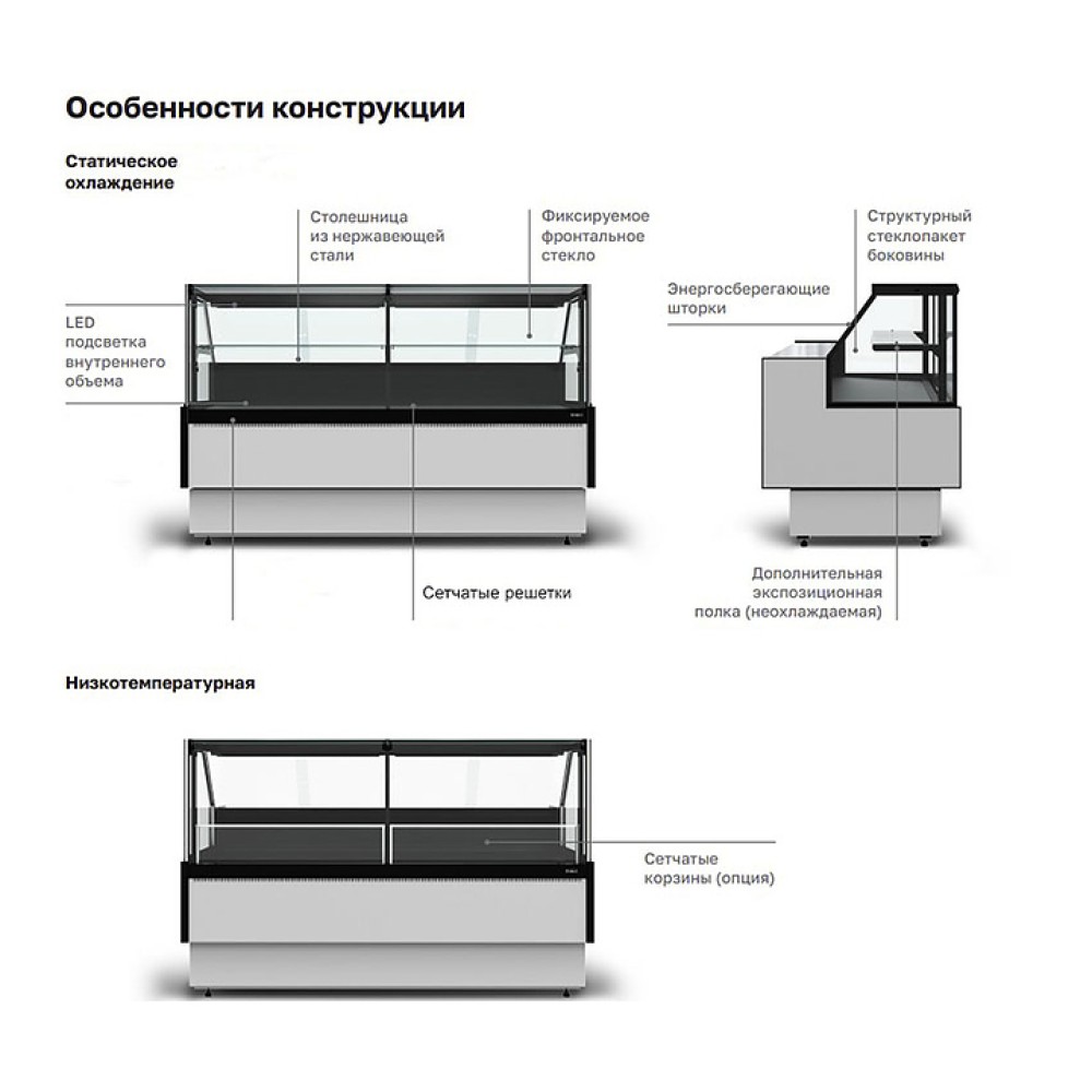 Модель без боковин предназначена для установки нескольких витрин в линию и не может использоваться как отдельностоящая. При заказе нескольких моделей для установки в линию достаточно приобрести две боковины для первой и последней витрины.