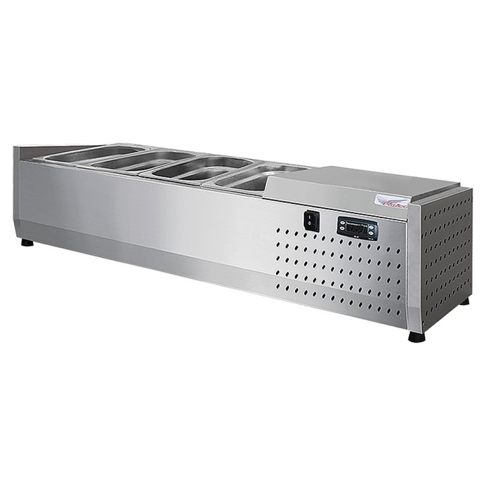 Настольная холодильная витрина Finist ToppingBox НХВо-4 предназначена для демонстрации и кратковременного хранения подготовленных начинок и топпингов для пиццы, блинов, лапши WOK, а также мясных изделий и полуфабрикатов на предприятиях общественного питания и торговли. Модель оснащена открытой камерой для размещения гастроемкостей, устойчивыми ножками, кабелем питания с вилкой и кнопочной панелью управления с цифровым дисплеем. Цельнозаливной корпус выполнен из высококачественной нержавеющей стали.