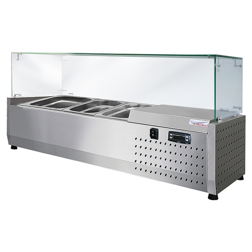 Настольная холодильная витрина Finist ToppingBox НХВсп-2,5 предназначена для демонстрации и кратковременного хранения подготовленных начинок и топпингов для пиццы, блинов, лапши WOK, а также мясных изделий и полуфабрикатов на предприятиях общественного питания и торговли. Прямоугольный купол предотвращает попадание в гастроемкости посторонних предметов. Цельнозаливной корпус выполнен из высококачественной нержавеющей стали, отличающейся прочностью и долговечностью, купол - из стекла.