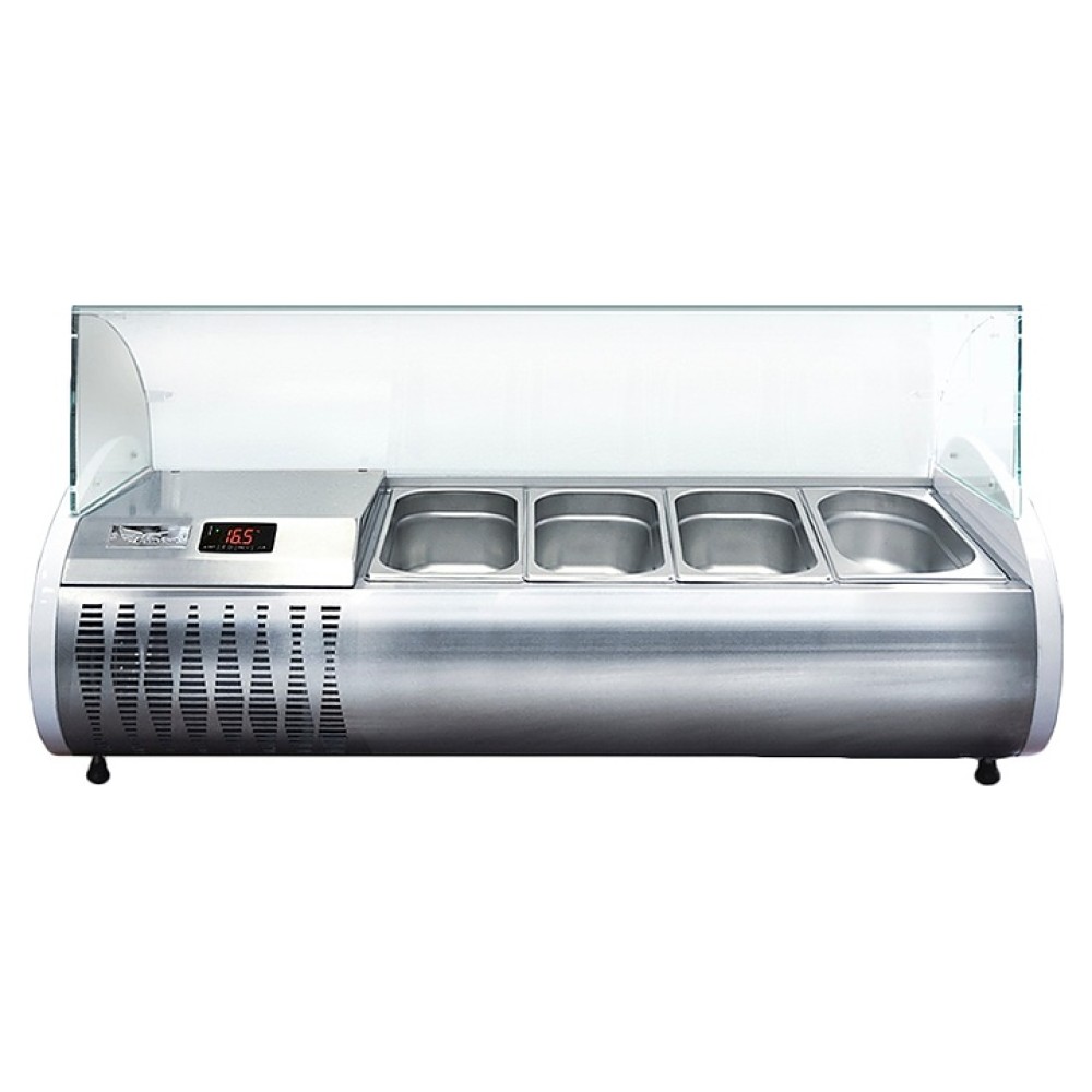 Настольная холодильная витрина Finist ToppingBox PERFECTUM TBP-3 предназначена для демонстрации и кратковременного хранения подготовленных начинок и топпингов для пиццы, блинов, лапши WOK, а также мясных изделий и полуфабрикатов на предприятиях общественного питания и торговли. Модель оснащена камерой для размещения гастроемкостей, декоративными боковыми панелями, устойчивыми ножками, кабелем питания с вилкой и кнопочной панелью управления с цифровым дисплеем. Цельнозаливной корпус выполнен из высококачественной нержавеющей стали, купол – из моллированного стекла.