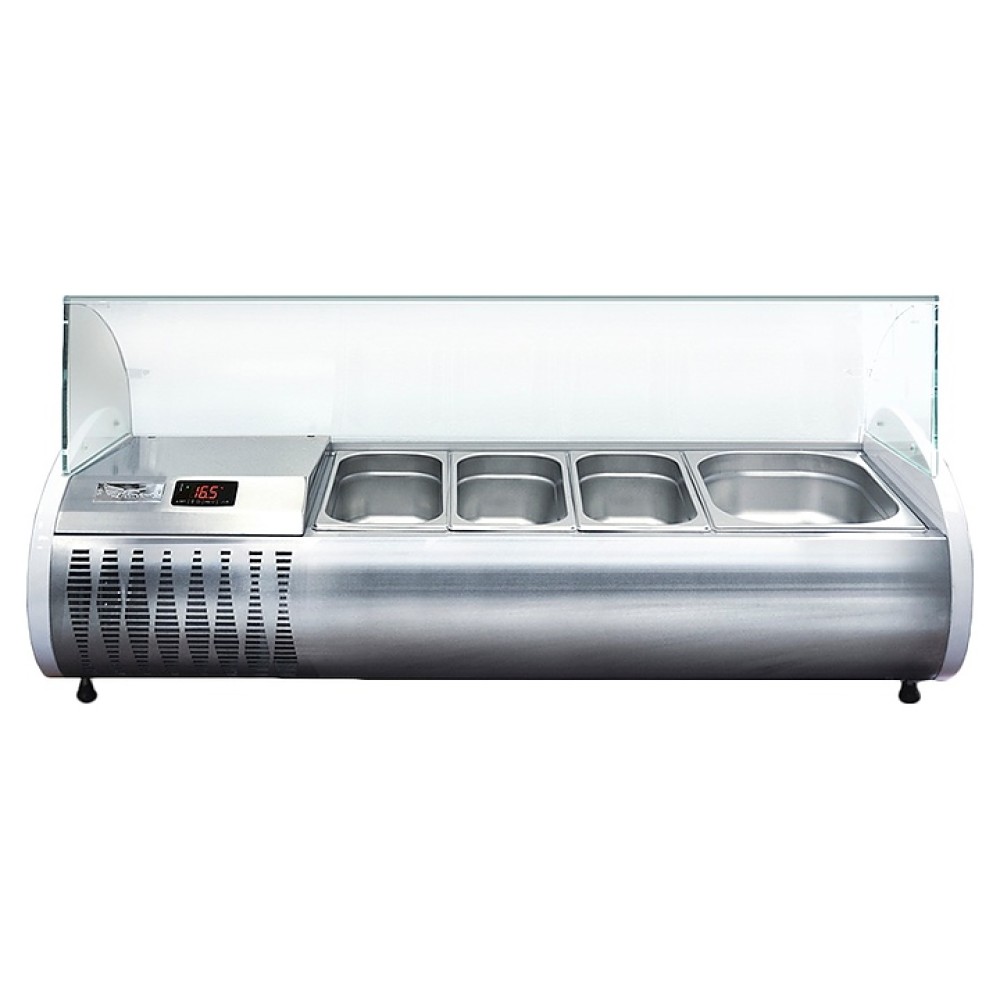 Настольная холодильная витрина Finist ToppingBox PERFECTUM TBP-4 предназначена для демонстрации и кратковременного хранения подготовленных начинок и топпингов для пиццы, блинов, лапши WOK, а также мясных изделий и полуфабрикатов на предприятиях общественного питания и торговли. Модель оснащена камерой для размещения гастроемкостей, декоративными боковыми панелями, устойчивыми ножками, кабелем питания с вилкой и кнопочной панелью управления с цифровым дисплеем. Цельнозаливной корпус выполнен из высококачественной нержавеющей стали, купол – из моллированного стекла.