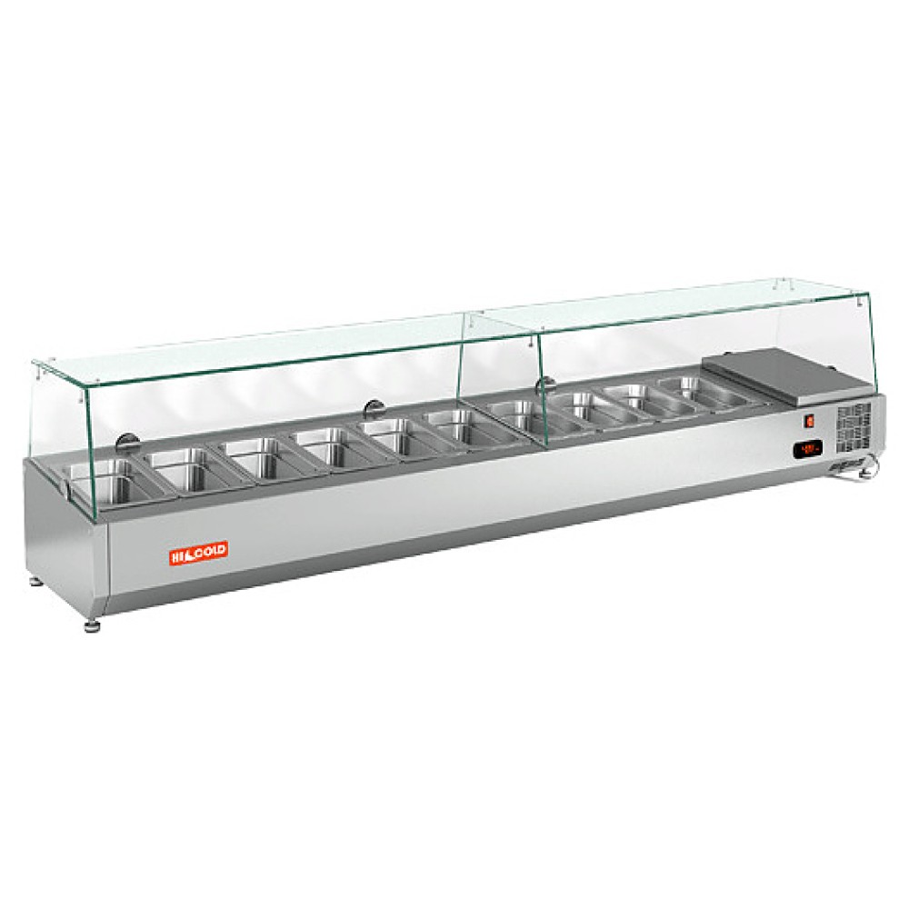 Настольная холодильная витрина HICOLD VRTG 2010 (1/4) используется на предприятиях общественного питания и торговли для демонстрации, охлаждения и кратковременного хранения салатов, гарниров, закусок и других готовых блюд. Модель оснащена электронной панелью управления, стеклянной надстройкой и опорными ножками. Корпус выполнен из нержавеющей стали.