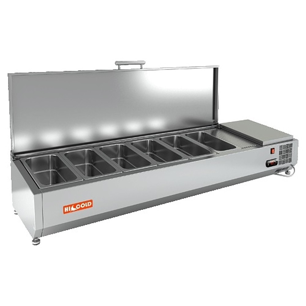 Настольная холодильная витрина HICOLD VRTU 1485 используется на предприятиях общественного питания и торговли для демонстрации, охлаждения и кратковременного хранения салатов, гарниров, закусок и других готовых блюд. Модель оснащена крышкой и специальным креплением для стола. Изделие выполнено из нержавеющей стали.