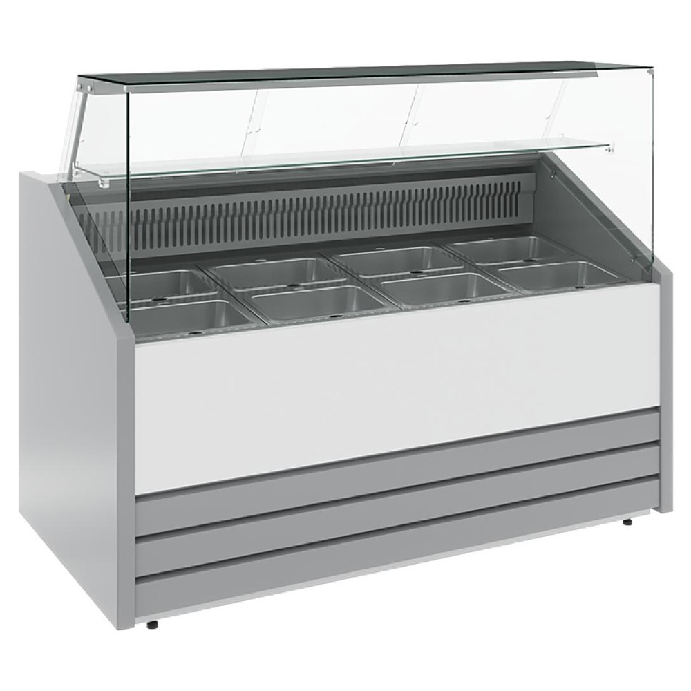 Холодильная витрина Carboma GC75 SM 1,2-1 используется на предприятиях общественного питания и торговли для охлаждения, кратковременного хранения, демонстрации и продажи продуктов питания, салатов, молочных и других гастрономических изделий. Модель оснащена дополнительным накопителем для продуктов, поддоном для выкладки и регулируемыми ножками высотой от 20 до 35 мм. Столешница, зона выкладки, боковые и нижняя фронтальная панели, обшивка светильника и испарителя выполнены из окрашенной в серебристый цвет стали, декоративная передняя панель - из выкрашенной в белый цвет стали, держатель стекла - из нержавеющей стали. Боковины и столешница покрыты пенополиуретановой теплоизоляцией.
