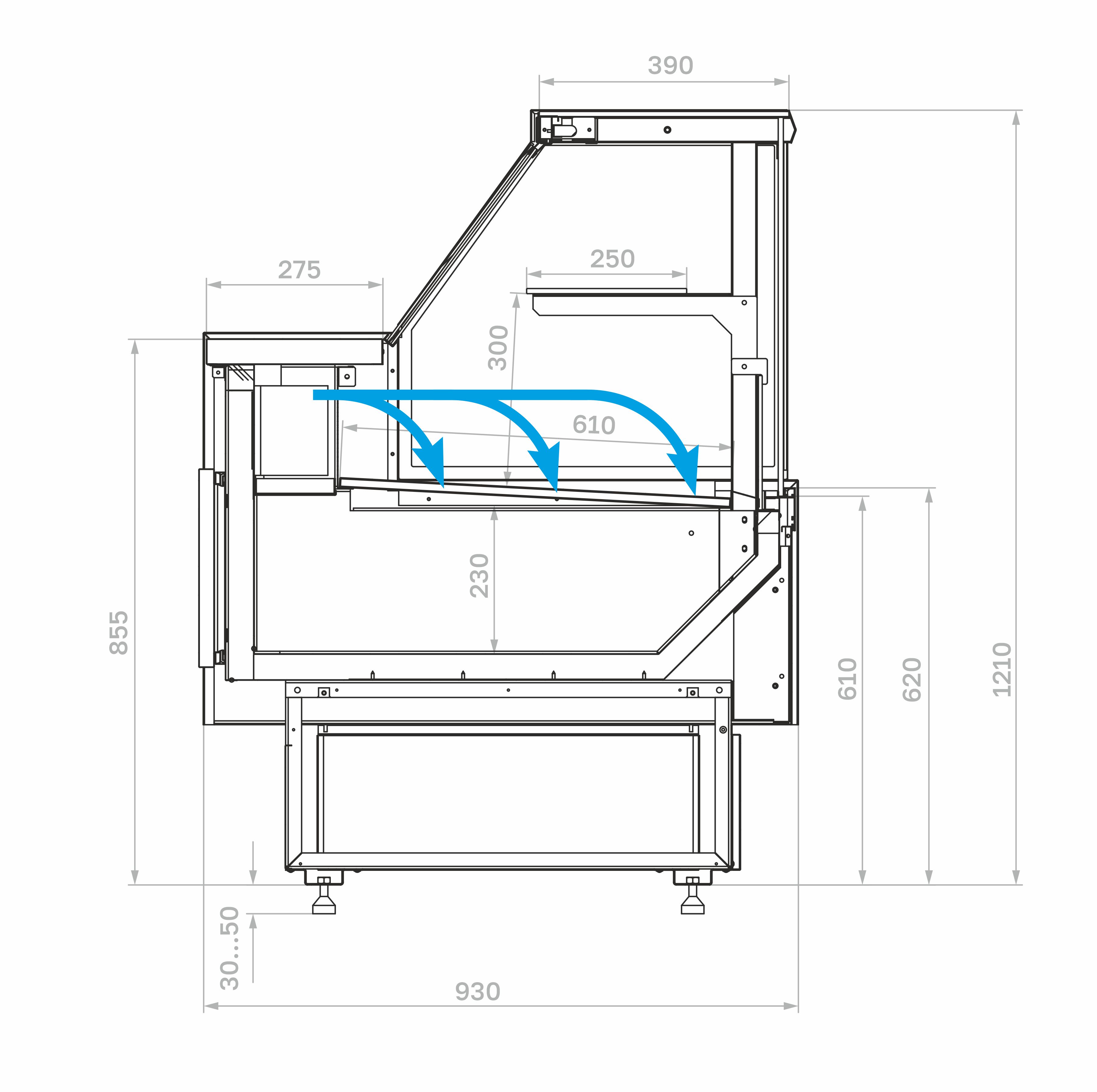 Модель без боковин предназначена для установки нескольких витрин в линию и не может использоваться как отдельностоящая. При заказе нескольких моделей для установки в линию достаточно приобрести две боковины для первой и последней витрины.