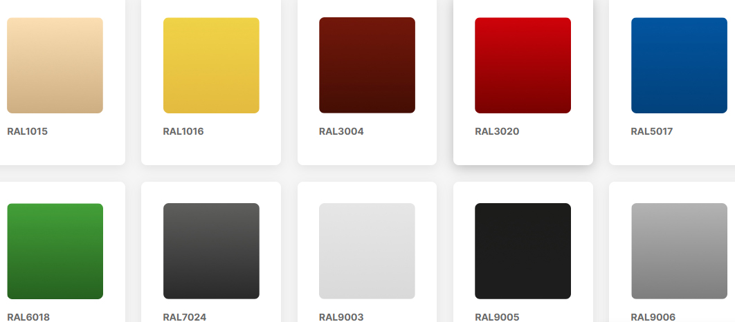 Модель доступна в 10 стандартных цветовых исполнениях фронтальной панели по таблице RAL: 9003, 9005, 9006, 1015, 1016, 3004, 3020, 5017, 6018 и 7024.