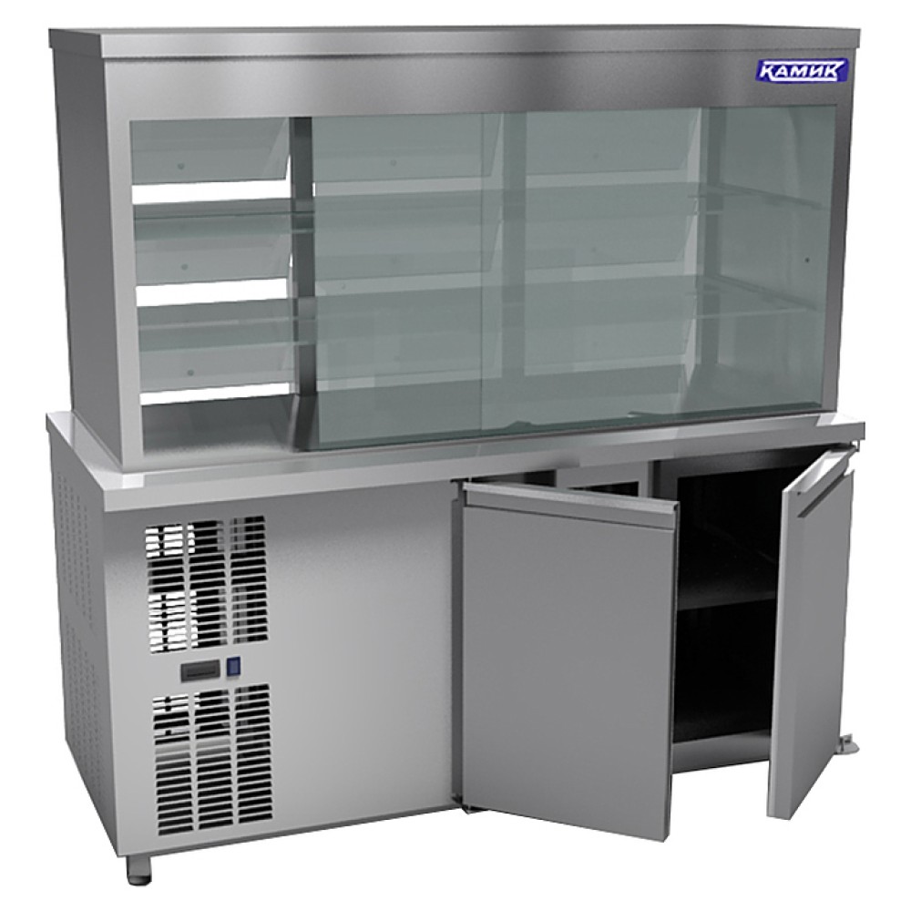 Холодильная витрина КАМИК ВХ-14060 используется на предприятиях общественного питания и торговли для охлаждения, демонстрации и кратковременного хранения продуктов питания и готовых блюд. Модель оснащена подсветкой. Нижняя часть конструкции разделена на секции, каждая из которых оборудована распашной дверью, сетчатой полкой и парой направляющих. В правой части конструкции расположен холодильный агрегат. Корпус выполнен из нержавеющей стали AISI 430 и AISI 304 толщиной 1 мм, полки - из стекла.