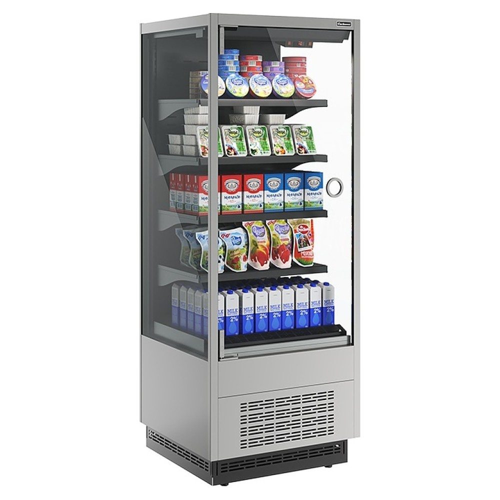 Холодильная горка Carboma FC 20-07 VM 0,7-1 версия 2.0 Light серии Cube 2 используется на предприятиях общественного питания и торговли для охлаждения, кратковременного хранения и предпродажной демонстрации напитков, мяса, птицы, полуфабрикатов, молочных и гастрономических изделий. Модель оснащена 4 рядами навесных полок с кронштейнами, распашной дверью, подставкой с фронтальной термовыводящей и цокольной решетками. Корпус прямоугольно ориентированной формы выполнен из стали с антикоррозийным покрытием внешних панелей, полок и кронштейнов цвета нержавеющая сталь (RAL 0430), цоколя и интерьера черного цвета (RAL 9005), теплоизоляция – из пенополиуретана.