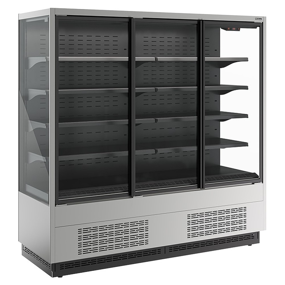 Холодильная горка Carboma FC 20-07 VV 1,9-1 версия 2.0 Standard серии Cube 2 используется на предприятиях общественного питания и торговли для охлаждения, кратковременного хранения и предпродажной демонстрации напитков, мяса, птицы, полуфабрикатов, молочных и гастрономических изделий. Модель оснащена 4 рядами навесных полок с кронштейнами, 3 распашными дверьми с рукоятками по всей длине створок, подставкой с фронтальной термовыводящей и цокольной решетками. Корпус прямоугольно ориентированной формы выполнен из стали с антикоррозийным покрытием внешних панелей, полок и кронштейнов серого цвета (RAL 9006), цоколя и интерьера черного цвета (RAL 9005), теплоизоляция – из пенополиуретана.