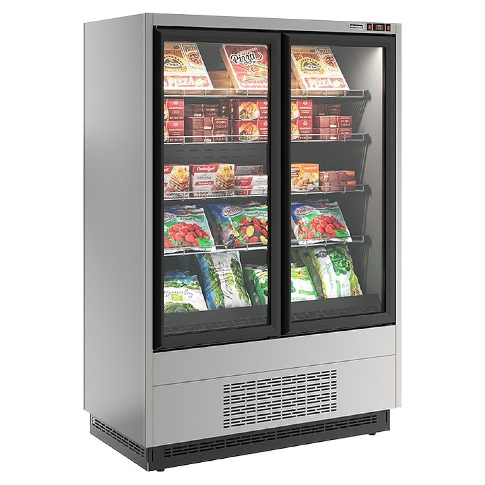 Морозильная горка Carboma FC 20-07 VL 1,0-1 версия 2.0 Standard серии Cube 2 используется на предприятиях общественного питания и торговли для кратковременного хранения и предпродажной демонстрации мяса, птицы и другой замороженной продукции. Модель оснащена 4 рядами навесных решетчатых полок с ограничителями, 2 распашными дверьми с рукоятками по всей длине створок, глухими боковинами, подставкой с фронтальной термовыводящей и цокольной решетками. Корпус прямоугольно ориентированной формы выполнен из стали с антикоррозийным покрытием внешних панелей и полок цвета нержавеющая сталь (RAL 0430), цоколя и дверных рам черного цвета (RAL 9005), теплоизоляция – из пенополиуретана.