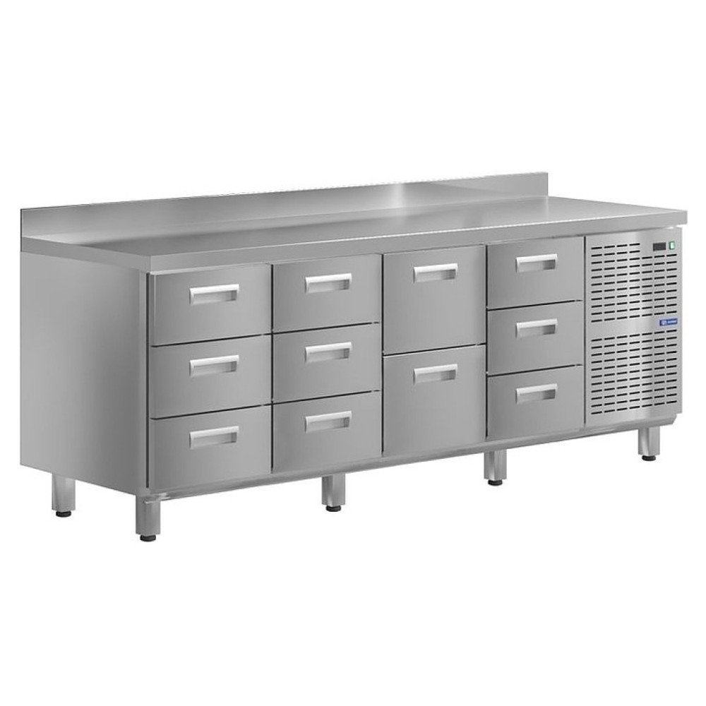 Холодильный стол KAYMAN KСХ-3323/70 предназначен для охлаждения, хранения и обработки пищевых продуктов в ресторанах, барах, кафе, столовых, на профессиональных кухнях и пищевых производствах. На прочной столешнице можно резать, раскатывать и отбивать полуфабрикаты. Модель оснащена 11 ящиками. Изделие выполнено из высококачественной нержавеющей стали, отличающейся прочностью и долговечностью.