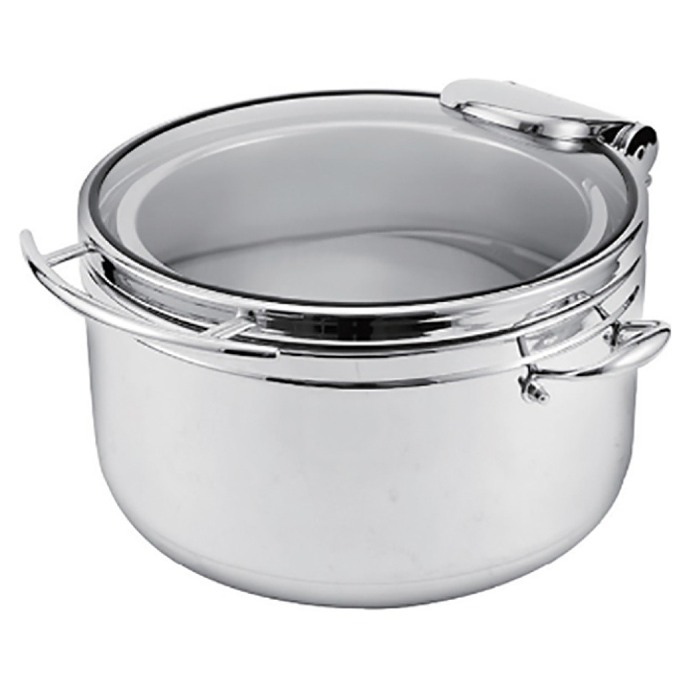 Чафинг-диш Kingo HOTEL 21303 предназначен для постоянного подогрева каши, супа и других блюд и поддержания их оптимальной температуры на предприятиях общественного питания и торговли. Модель имеет круглую форму и оснащена обзорной откидной крышкой с ручкой. Изделие выполнено из нержавеющей полированной стали, крышка - из нержавеющей стали со стеклянной вставкой.