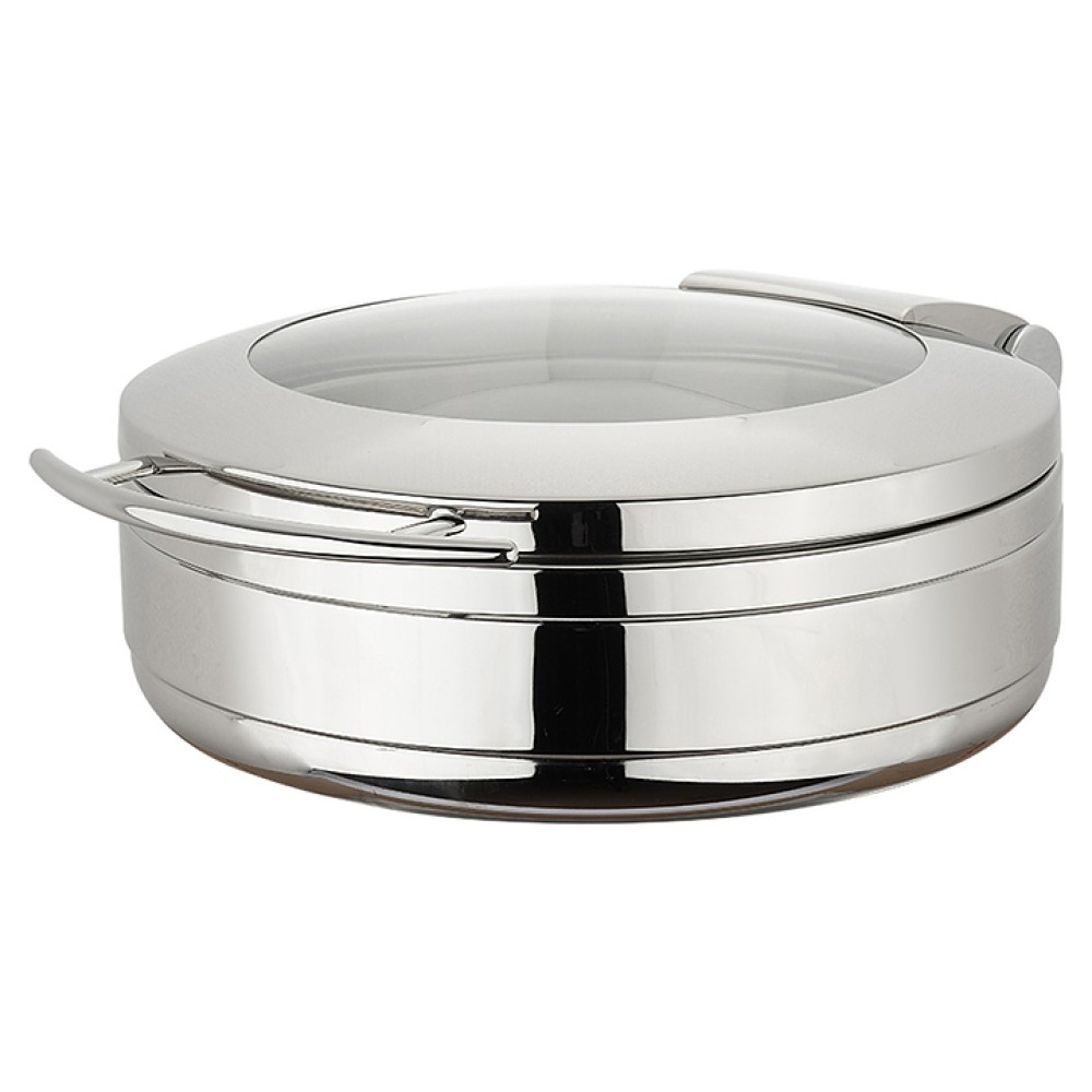 Чафинг-диш Kingo HOTEL J19305 предназначен для постоянного подогрева каши, супа и других блюд и поддержания их оптимальной температуры на предприятиях общественного питания и торговли. Модель имеет круглую форму и оснащена обзорной откидной крышкой с ручкой. Изделие выполнено из нержавеющей полированной стали, крышка - из нержавеющей стали со стеклянной вставкой.