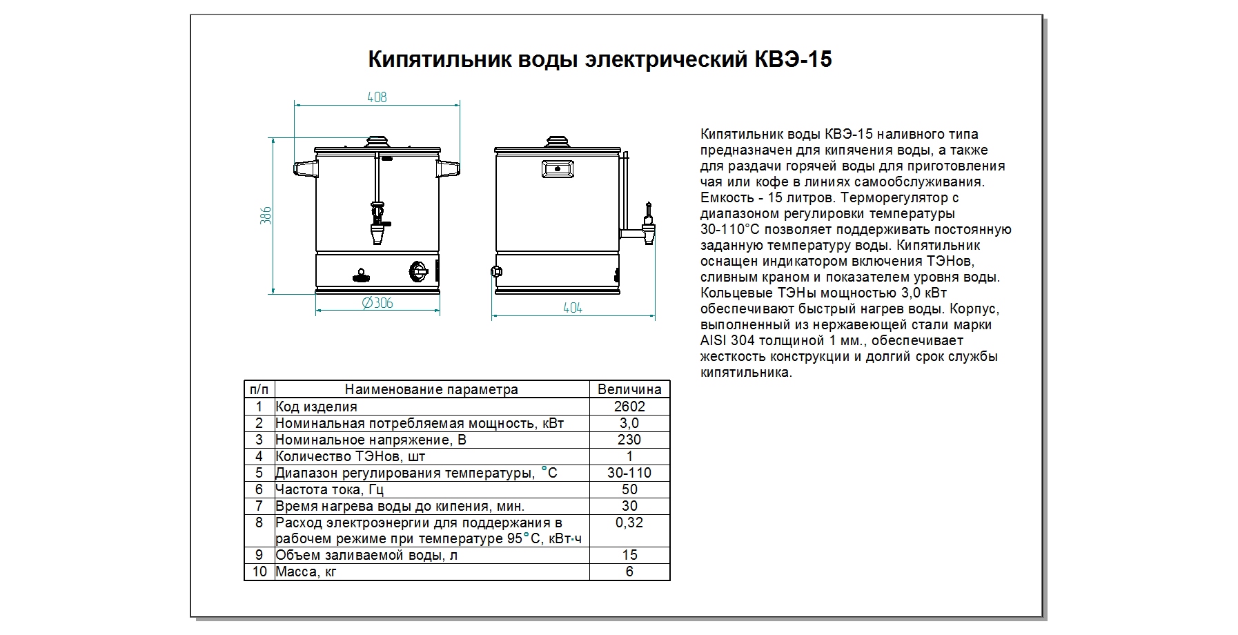 Кипятильник Abat КВЭ-15 предназначен для нагрева, кипячения и раздачи воды и приготовления горячих напитков на предприятиях общественного питания и торговли. Модель оснащена световым индикатором работы ТЭНа, индикатором уровня воды, регулятором температуры и краном для розлива кипятка.