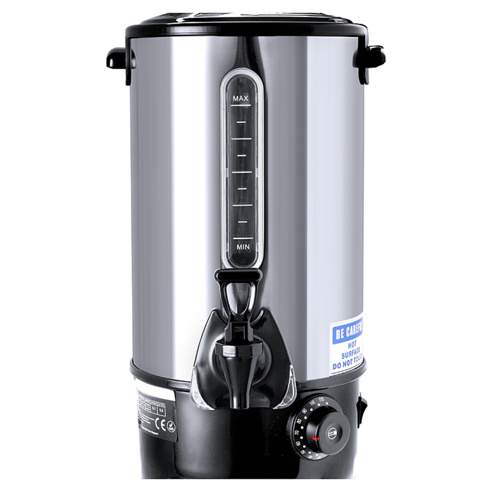 Наливной кипятильник Foodatlas WB-10 предназначен для подогрева воды на предприятиях общественного питания и торговли. Модель оснащена терморегулятором, 2 нагревательными элементами, индикаторами уровня воды, мощности и нагрева, сливным краном и автоматической защитой от сухого нагрева. Корпус выполнен из нержавеющей стали 201, камера - из нержавеющей стали 304