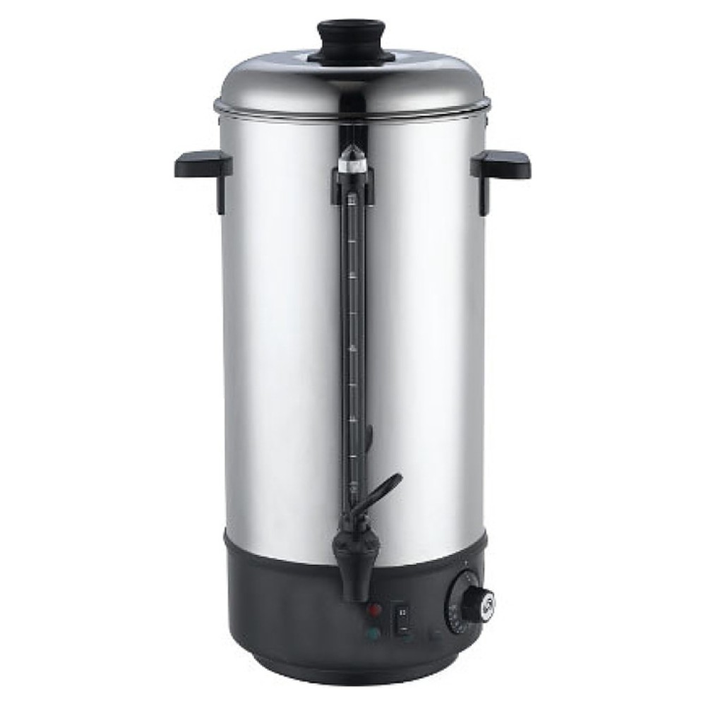 Термопот CuisinAid CD-WB16 предназначен для подогрева воды и приготовления горячих напитков на предприятиях общественного питания и торговли, в офисах, на мероприятиях с организацией шведского стола, а также в домашних условиях. Модель оснащена краном для розлива, крышкой с рукояткой, боковыми транспортировочными рукоятками и электромеханическим управлением. Корпус выполнен из нержавеющей стали, основание и фурнитура – из черного пластика.