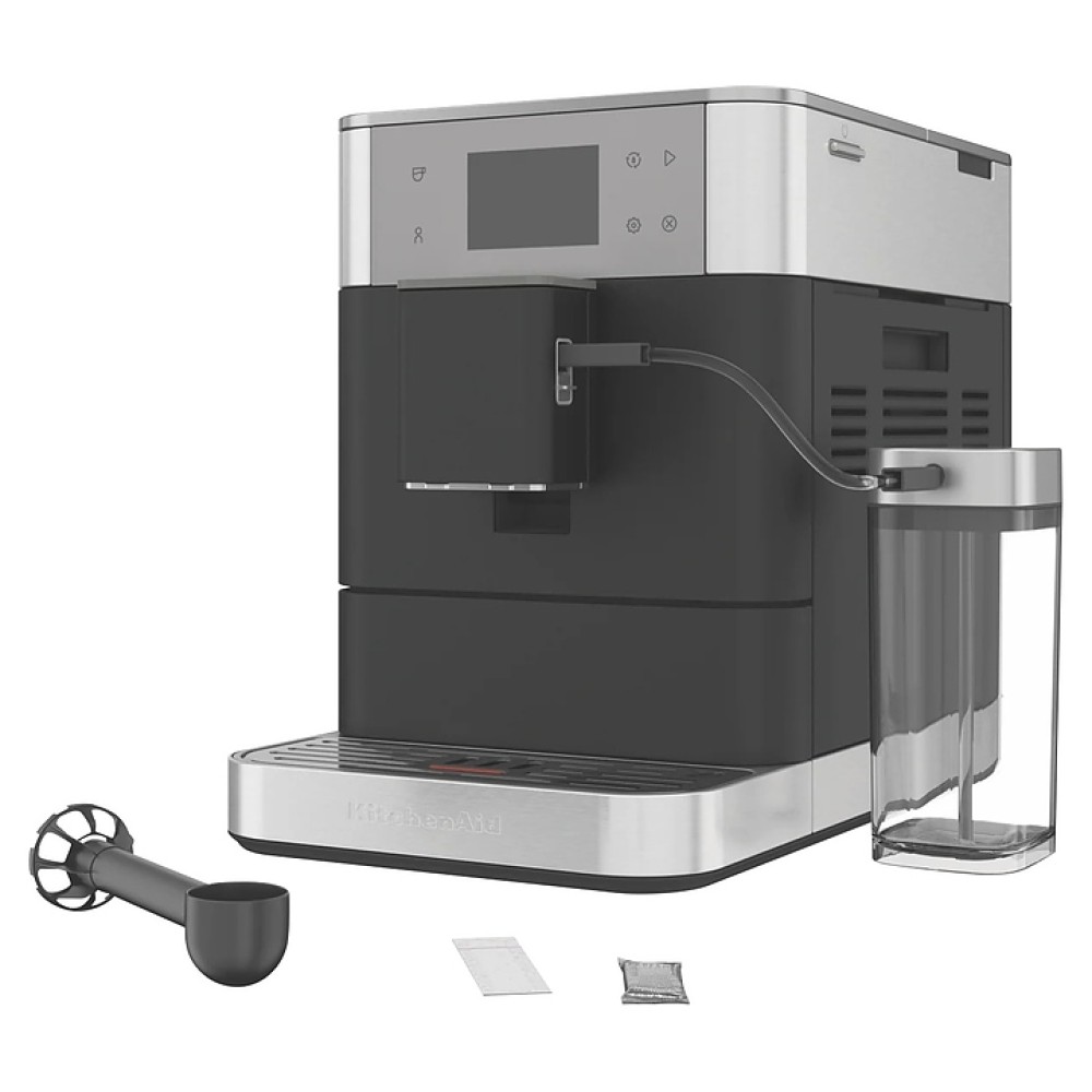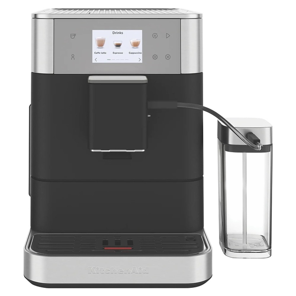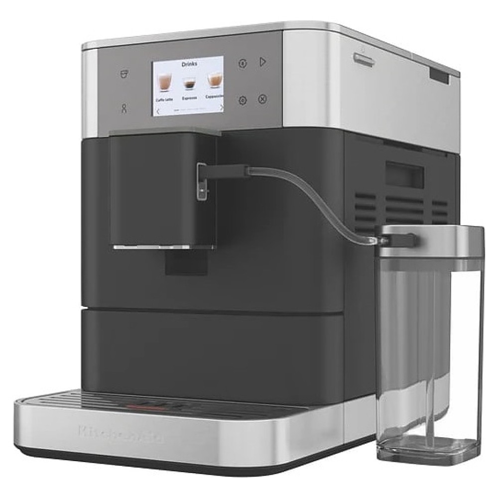 Автоматическая эспрессо кофемашина KitchenAid KF7 5KES8557EBK предназначена для приготовления кофе эспрессо и напитков на его основе в домашних условиях. Модель оснащена встроенными насосом и капучинатором, диспенсером с 2 соплами, кабелем питания с вилкой и расположенной на фронтальной стенке электронной панелью с сенсорными функциональными клавишами и информативным цветным сенсорным дисплеем управления и индикации. Корпус прямоугольно ориентированной формы выполнен из металла и АБС-пластика с поверхностью оттенка черный чугун (Cast Iron Black Edition), окантовки по периметру верхей части и основания с серебристой поверхностью, жернова кофемолки – из закаленной стали.