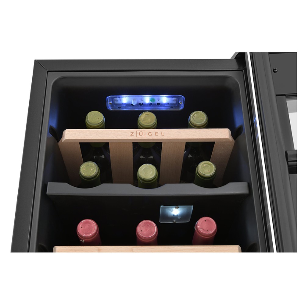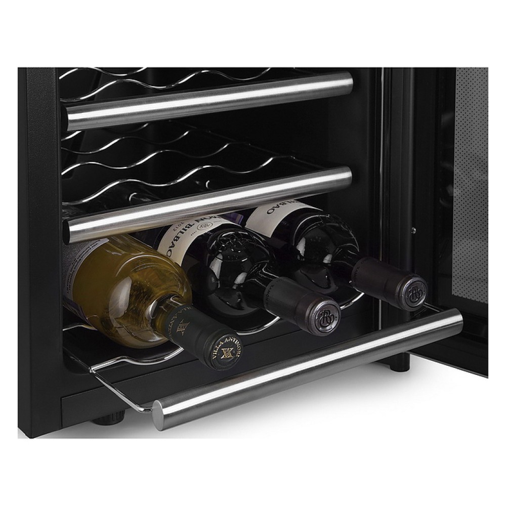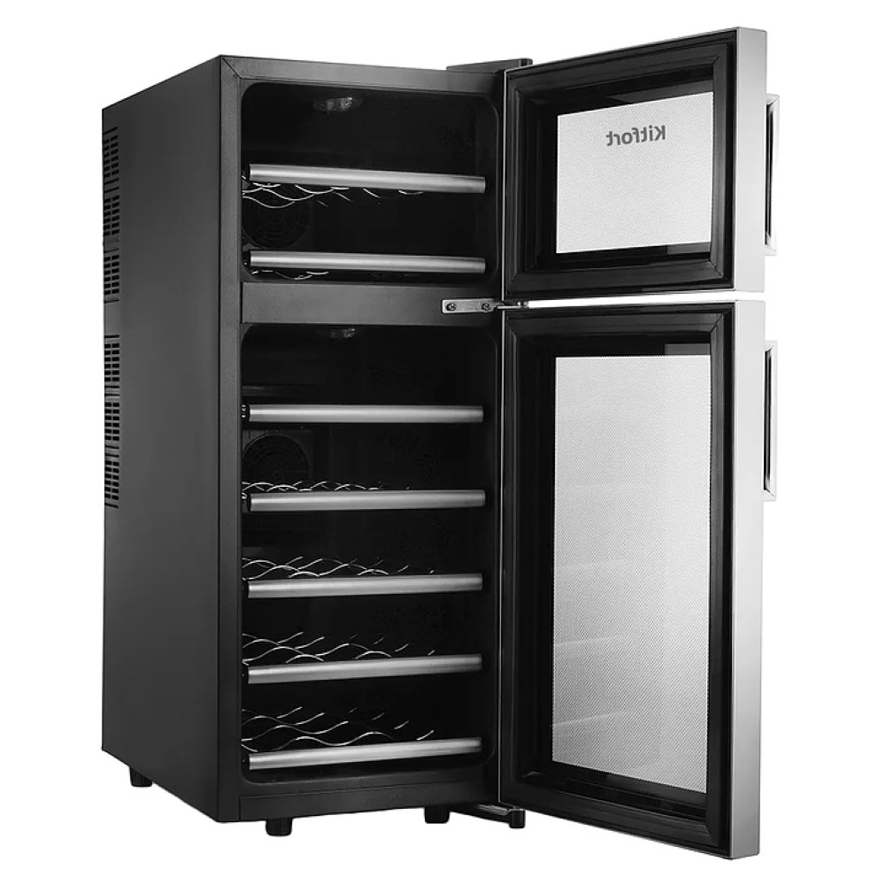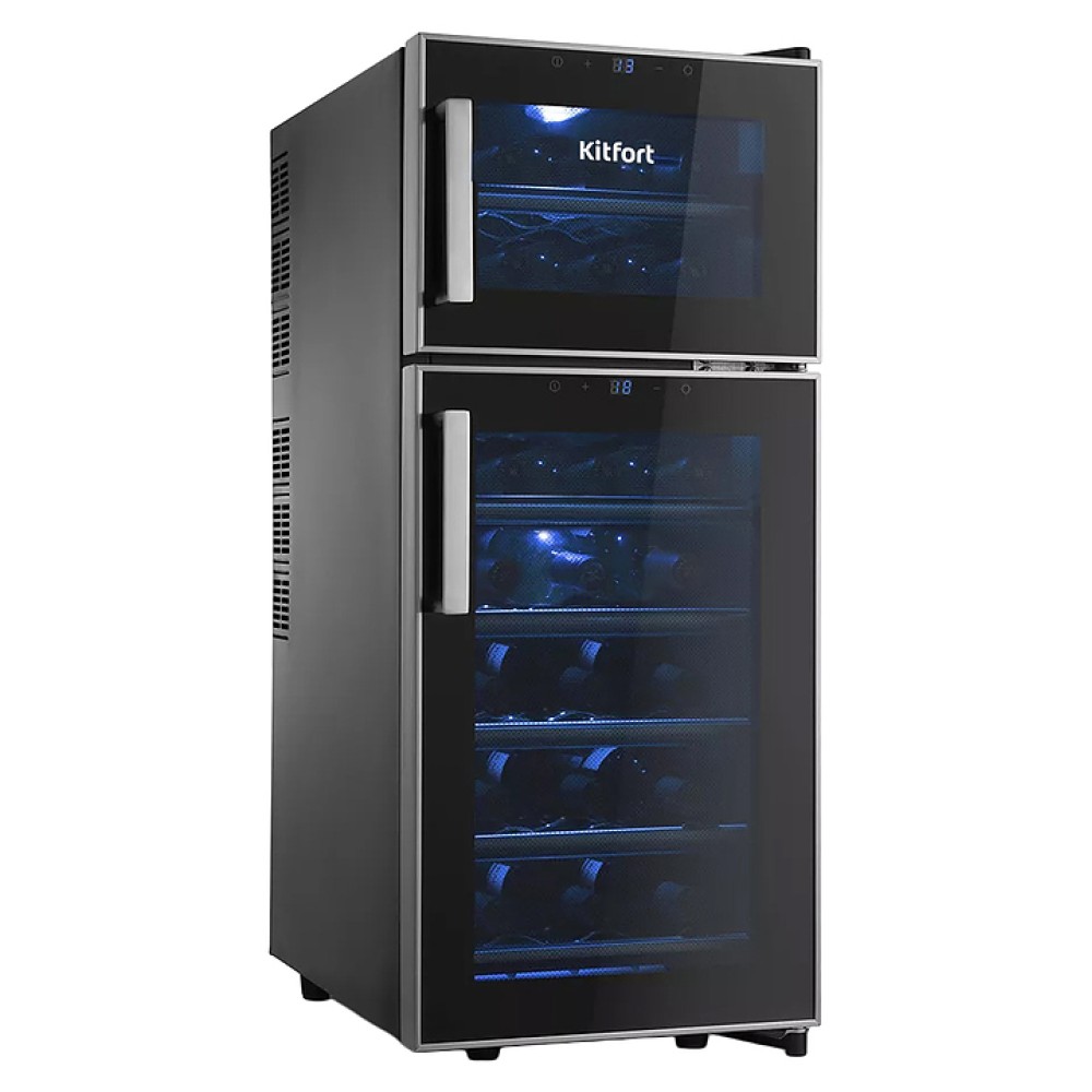 Винный шкаф Kitfort KT-2407 предназначен для хранения при оптимальных условиях бутилированного вина различных сортов в барах, ресторанах, специализированных магазинах, подсобных складских помещениях, а также домашних условиях. Модель оснащена 2 холодильными камерами с правосторонними распашными дверьми с вертикальными рукоятками и обзорным остеклением, интегрированными направляющими для полок, кабелем питания, расположенной на фасаде верхней двери электронной панелью управления с сенсорными функциональными клавишами и 2 цифровыми светодиодными дисплеями с белой подсветкой индикации. Корпус выполнен из металла с матовым антикоррозийным покрытием черного цвета, рамы дверей черного цвета с полным фронтальным остеклением без винтового крепежа, рукоятки и торцы дверей с серебристой поверхностью, внутренняя облицовка камер черного цвета, остекление – из тонированного закаленного стекла, полки – из металла.