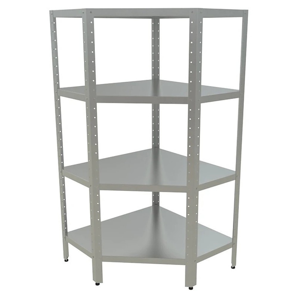 Угловой кухонный стеллаж Кобор СКУ-4/4-80/80 предназначен для хранения посуды, различного инвентаря и сухих продуктов на предприятиях общественного питания и торговли. Модель оснащена сплошными полками. Разборный каркас выполнен из уголка из оцинкованной стали, полки - из нержавеющей стали AISI 430.