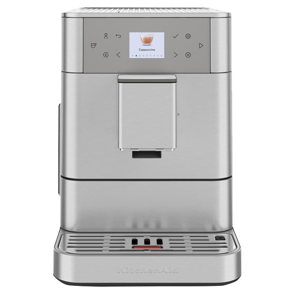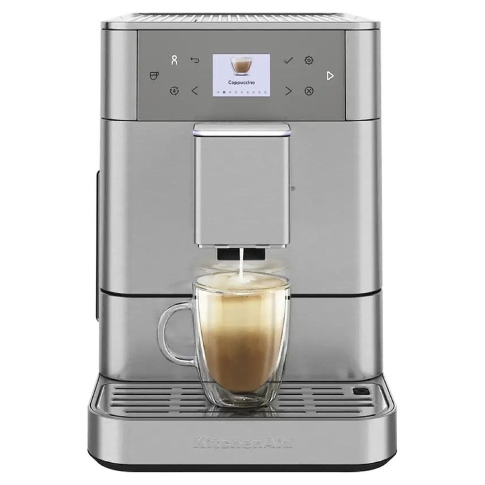 Автоматическая эспрессо кофемашина KitchenAid KF6 5KES8556ESX предназначена для приготовления кофе эспрессо и напитков на его основе в домашних условиях. Модель оснащена встроенными насосом и капучинатором, диспенсером, кабелем питания с вилкой и расположенной на фронтальной стенке электронной панелью управления с сенсорными функциональными клавишами и информативным цветным жидкокристаллическим дисплеем индикации. Корпус прямоугольно ориентированной формы выполнен из металла и АБС-пластика с поверхностью оттенка нержавеющая сталь, окантовки по периметру верхей части и основания с серебристой поверхностью, жернова кофемолки – из закаленной стали.