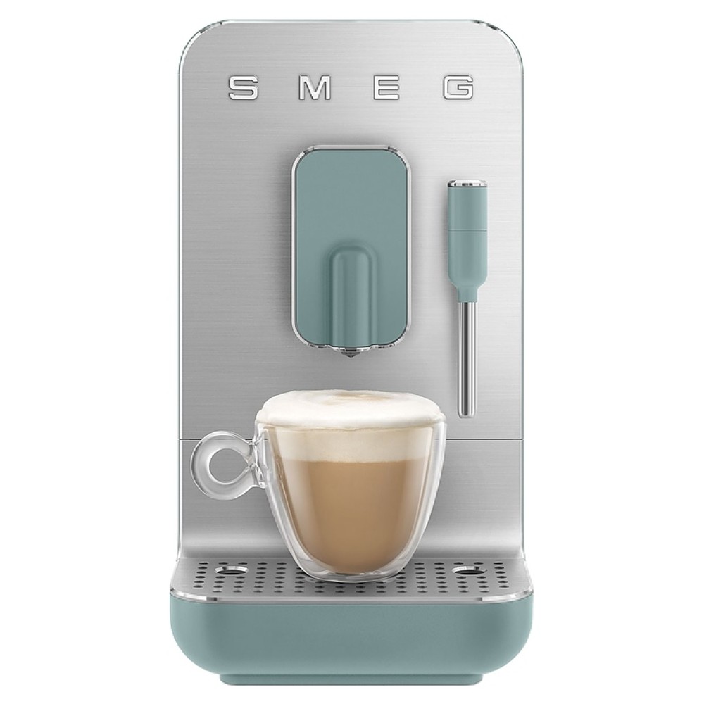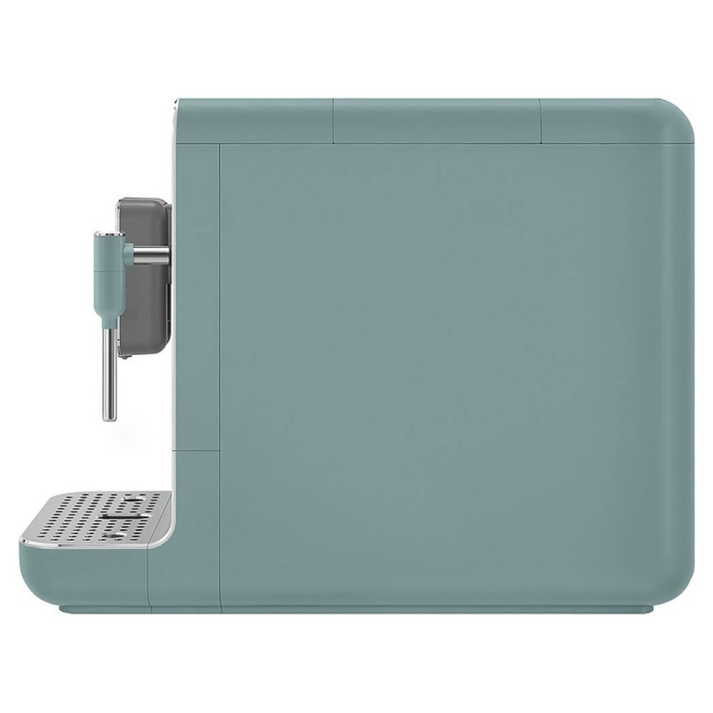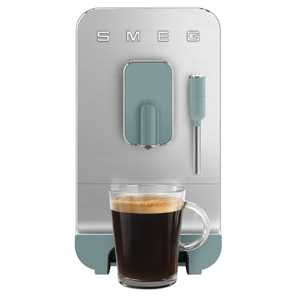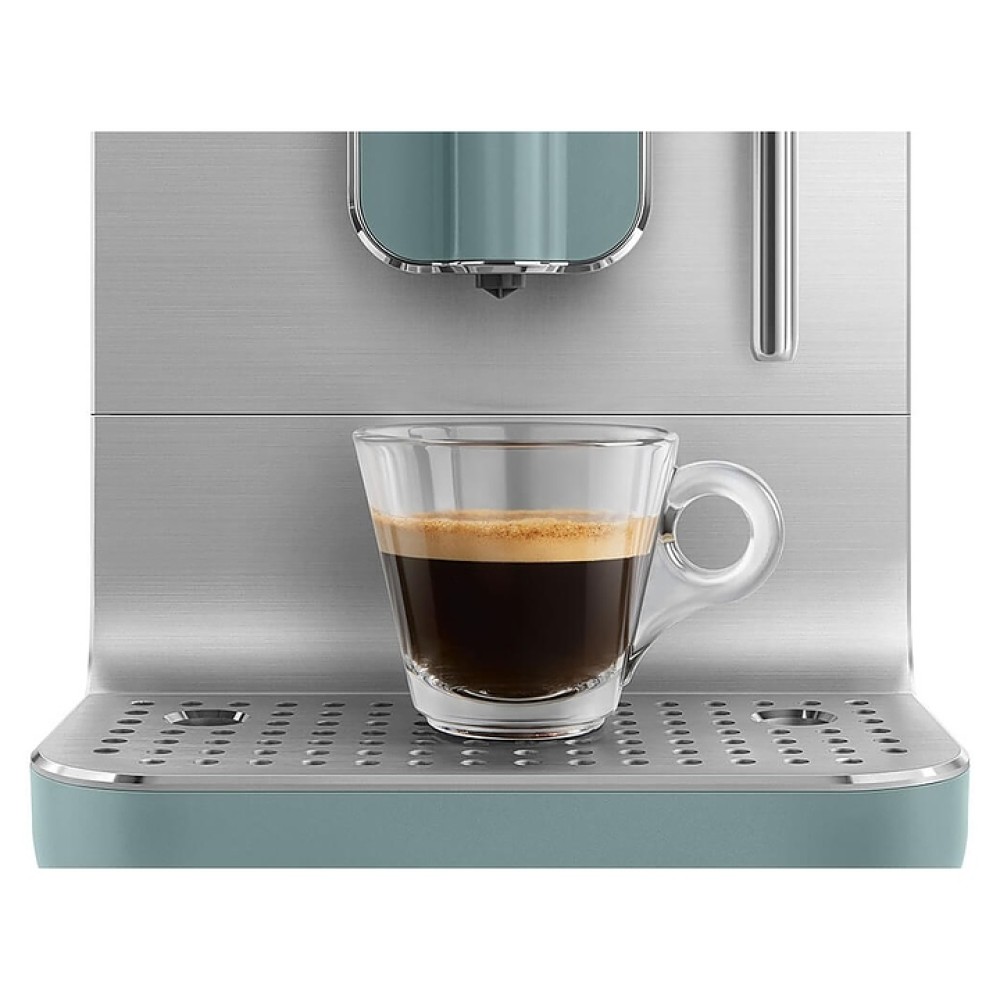 Автоматическая эспрессо кофемашина SMEG BCC12EGMEU предназначена для приготовления эспрессо и кофейных напитков на его основе в офисах, гостиницах и домашних условиях. Модель оснащена съемным кабелем питания с евровилкой (Shuko), расположенной на верхней стенке панелью управления с нажимными кнопками и светодиодными индикаторами. Корпусы прибора и основания подставки для чашек, фронт диспенсера, рукоятка трубки подачи и кнопки выполнены из пластика с внешней поверхностью изумрудно-зеленого оттенка, фронтальная панель и поддон для чашек – из алюминия с сатинированной поверхностью и полированной кромкой, объемные накладные литеры логотипа – из пластика с серебристой поверхностью, бойлер, жернова, трубка подачи горячей воды / пара – из нержавеющей стали, резервуар для воды – из сополимера стирола и акрилонитрила (SAN) дымчатого оттенка, корпус диспенсера и рукоятка резервуара – из серого пластика, изоляция кабеля серого цвета.