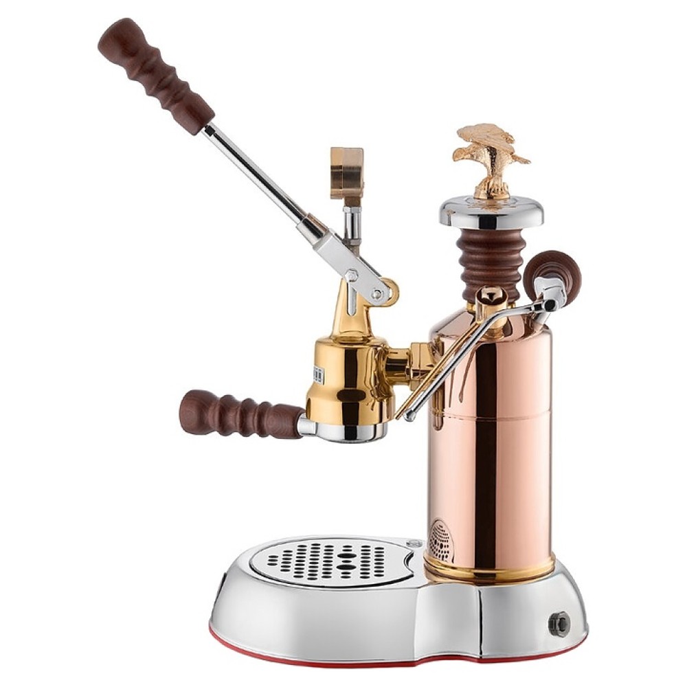 Леверная рожковая эспрессо кофемашина La Pavoni LPLESE01EU серии Esperto используется для приготовления кофе и напитков на его основе в домашних условиях. Модель оснащена ручным прессом с длинным прямым рычагом, капучинатором, подставкой для чашек, кабелем питания с евровилкой и декоративной съемной накладкой для крышки бойлера с фигуркой расправившего крылья орла. Корпус цилиндрической формы выполнен из латуни с покрытием медного оттенка, заварочный блок и элементы автокапучинатора – из латуни с покрытием золотистого оттенка, капучинатор – из латуни с хромиронным покрытием, основание и рычаг – из стали с хромированным покрытием, темпер – из стали, накладка крышки – из металла с покрытием в комбинации золотистого и хромированного оттенков, поддон каплесборника – из черного пластика, рукоятки подачи пара, рычага, холдеров и крышки бойлера – из дерева с покрытием темно-коричневого оттенка, подкладка основания с дренажной заглушкой – из силикона красного оттенка.