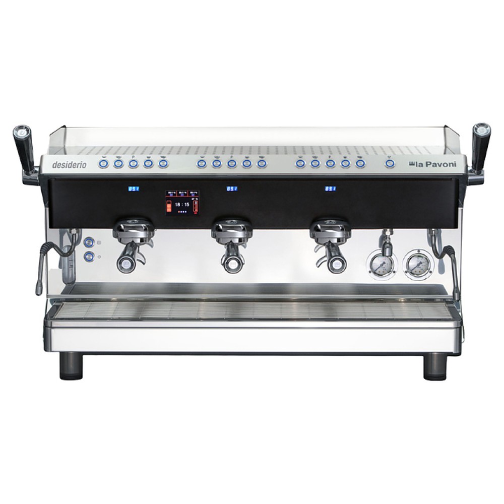Кофемашина La Pavoni DESIDERIO3VNEU серии DESIDERIO используется на предприятиях общественного питания и торговли, в офисах, а также в домашних условиях для приготовления чая, кофе и кофейных напитков. Модель оснащена 2 литыми никелированными латунными группами с вертикальной инфузионной камерой. Каплесборник с решеткой выполнен из нержавеющей стали AISI 304, бойлер - из меди.