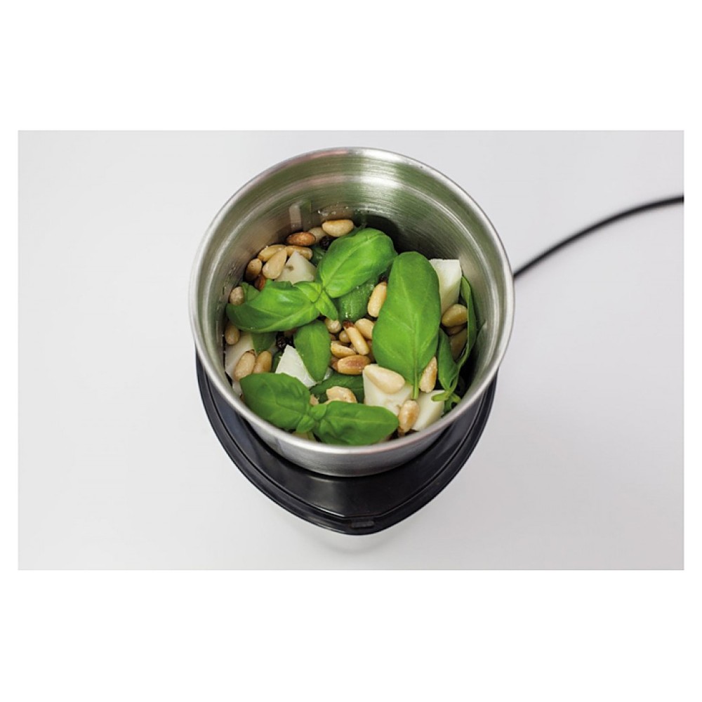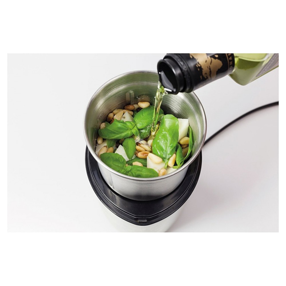 Кофемолка CASO Coffee & Kitchen Flavour используется в частных домах и квартирах, отелях и офисах для получения молотого кофе из зерен, а также измельчения очищенных орехов, специй и трав и приготовления соусов. Модель оснащена 2 чашами для измельчения - с ножом с 2 лезвиями и с ножом с 4 лезвиями и прозрачной крышкой. Корпус и лезвия выполнены из нержавеющей стали, крышка - из пластика.