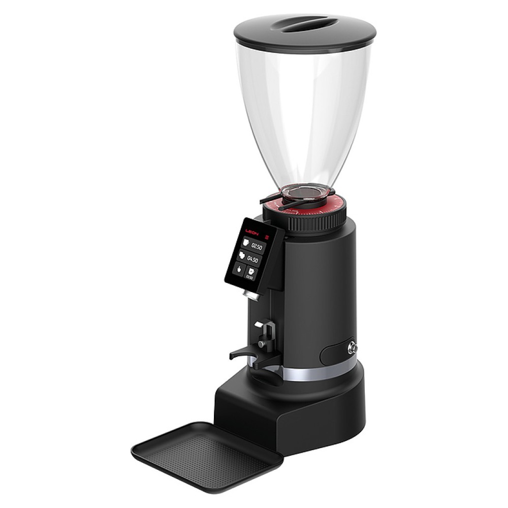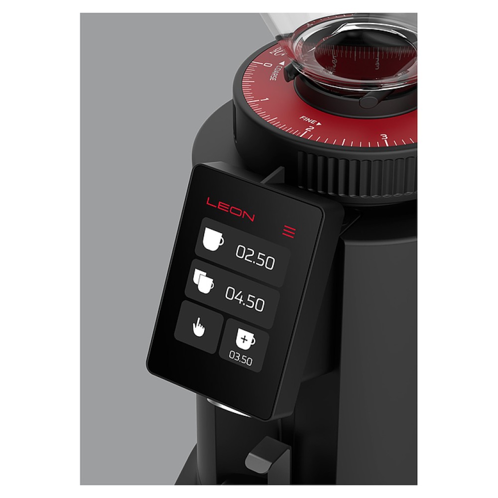 Автоматическая кофемолка Leon 800 используется в кофейнях, барах, кафе, на других предприятиях общественного питания и торговли, а также в домашних условиях для измельчения кофейных зерен. Модель оснащена воронкообразным бункером для кофейных зерен с крышкой с интегрированной ручкой, кабелем питания с вилкой, расположенным на боковой панели выключателем и дозатором с расположенным под наклоном сенсорным дисплеем управления. Корпус прибора выполнен из материала с черной матовой поверхностью, жернова – из высококачественной закаленной стали, крышка – из черного пластика.