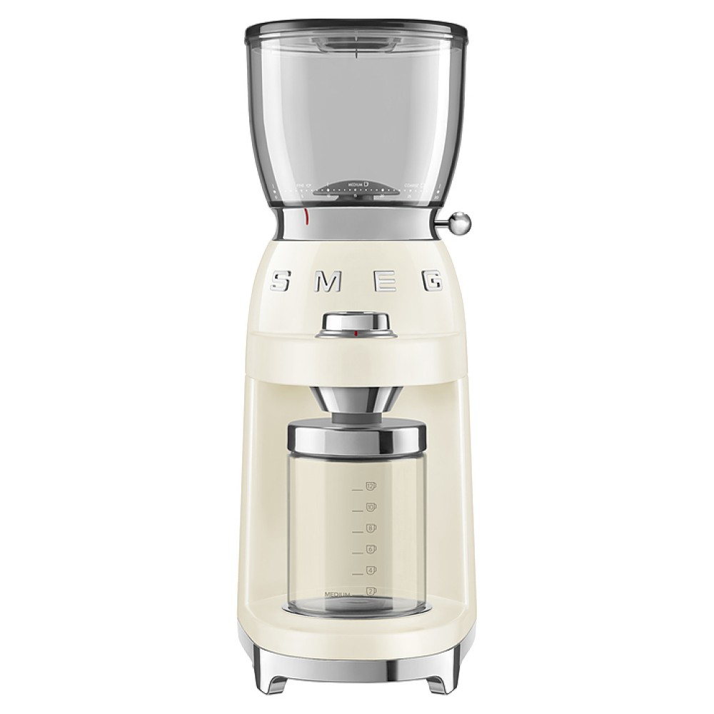 Кофемолка Smeg CGF01CREU используется в частных домах и квартирах для размола кофейных зерен. Модель выполнена в стиле 50-х годов. Корпус изготовлен из окрашенного металла, конические жернова и магнитный держатель съемного контейнера для молотого кофе - из нержавеющей стали, контейнеры для зерен кофе и молотого кофе - из Tritan™.