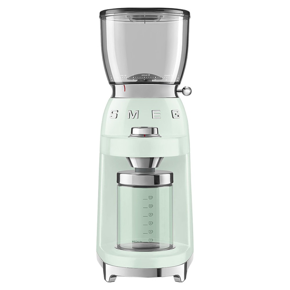 Кофемолка Smeg CGF01PGEU используется в частных домах и квартирах для размола кофейных зерен. Модель выполнена в стиле 50-х годов. Корпус изготовлен из окрашенного металла, конические жернова и магнитный держатель съемного контейнера для молотого кофе - из нержавеющей стали, контейнеры для зерен кофе и молотого кофе - из Tritan™.