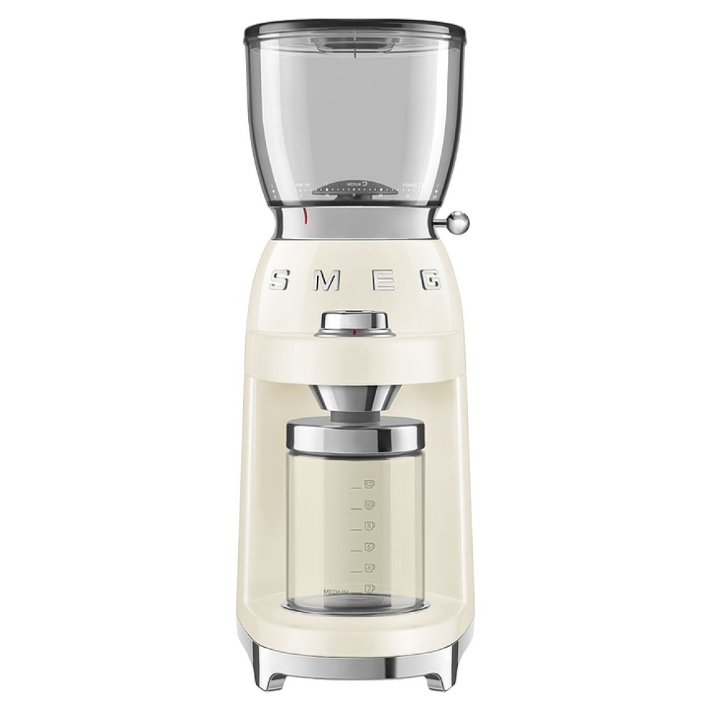 Кофемолка SMEG CGF11CREU предназначена для приготовления молотого кофе из зерен в гостиницах, офисах и домашних условиях. Модель оснащена интегрированной подставкой для емкости с готовым продуктом, кабелем питания с вилкой и электромеханическим управлением. Корпус выполнен из нержавеющей стали с глянцевым внешним покрытием кремового оттенка и накладными объемными серебристыми литерами логотипа, жернова – из нержавеющей стали, рукоятка рычага – из стали SUS304 с серебристой поверхностью, основание, регулировочная ручка, крышка контейнера – из пластика с хромированной поверхностью, бункер и контейнер – из высокопрочного полимера Tritan Renew без содержания вредных компонентов, крышка бункера, подставка для холдера (держателя фильтра) и щетка – из пластика, изоляция кабеля серого цвета.