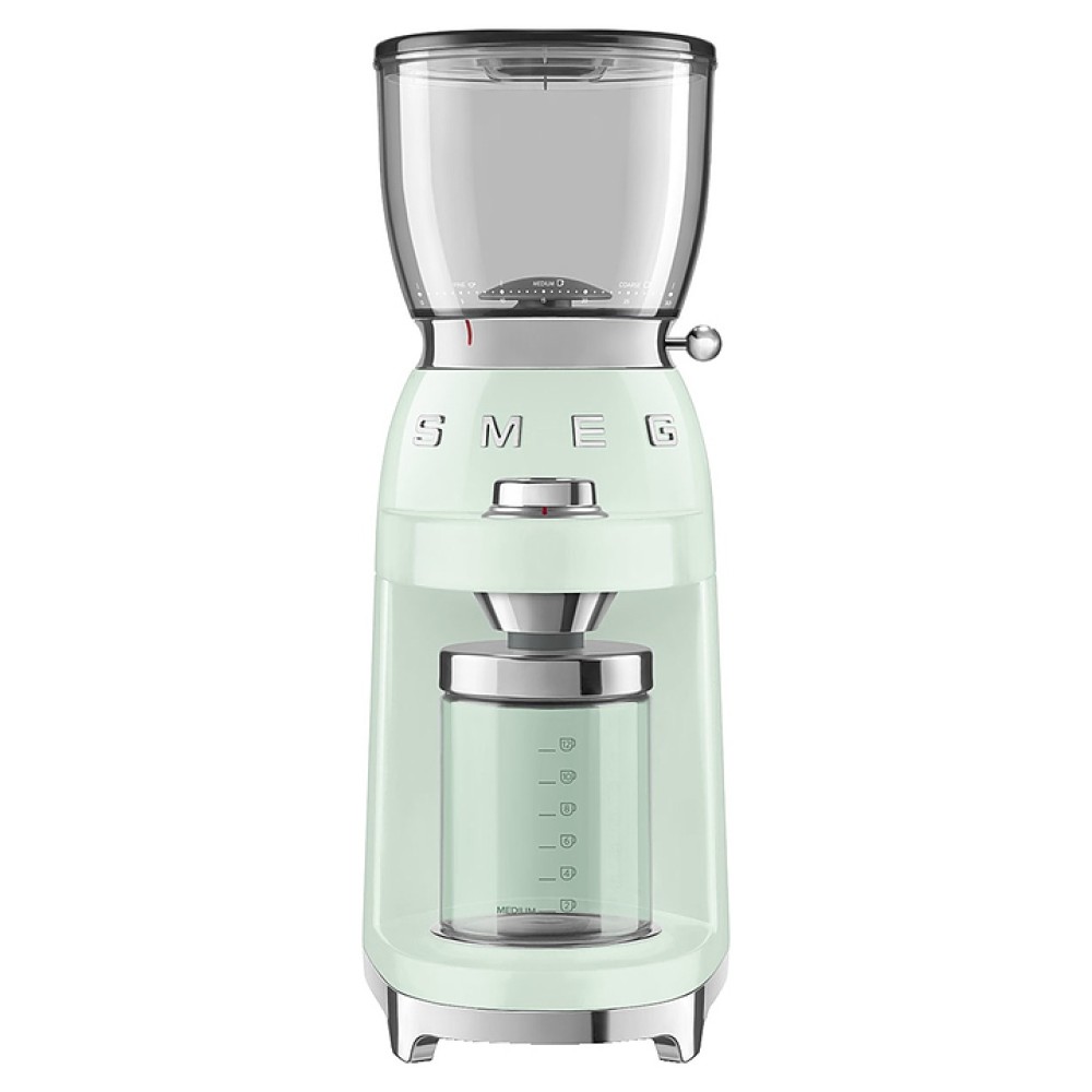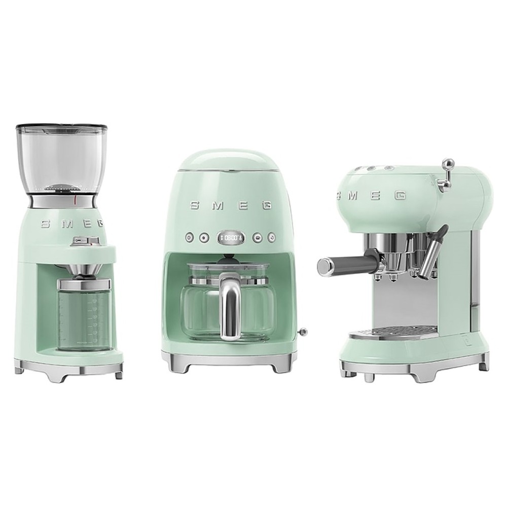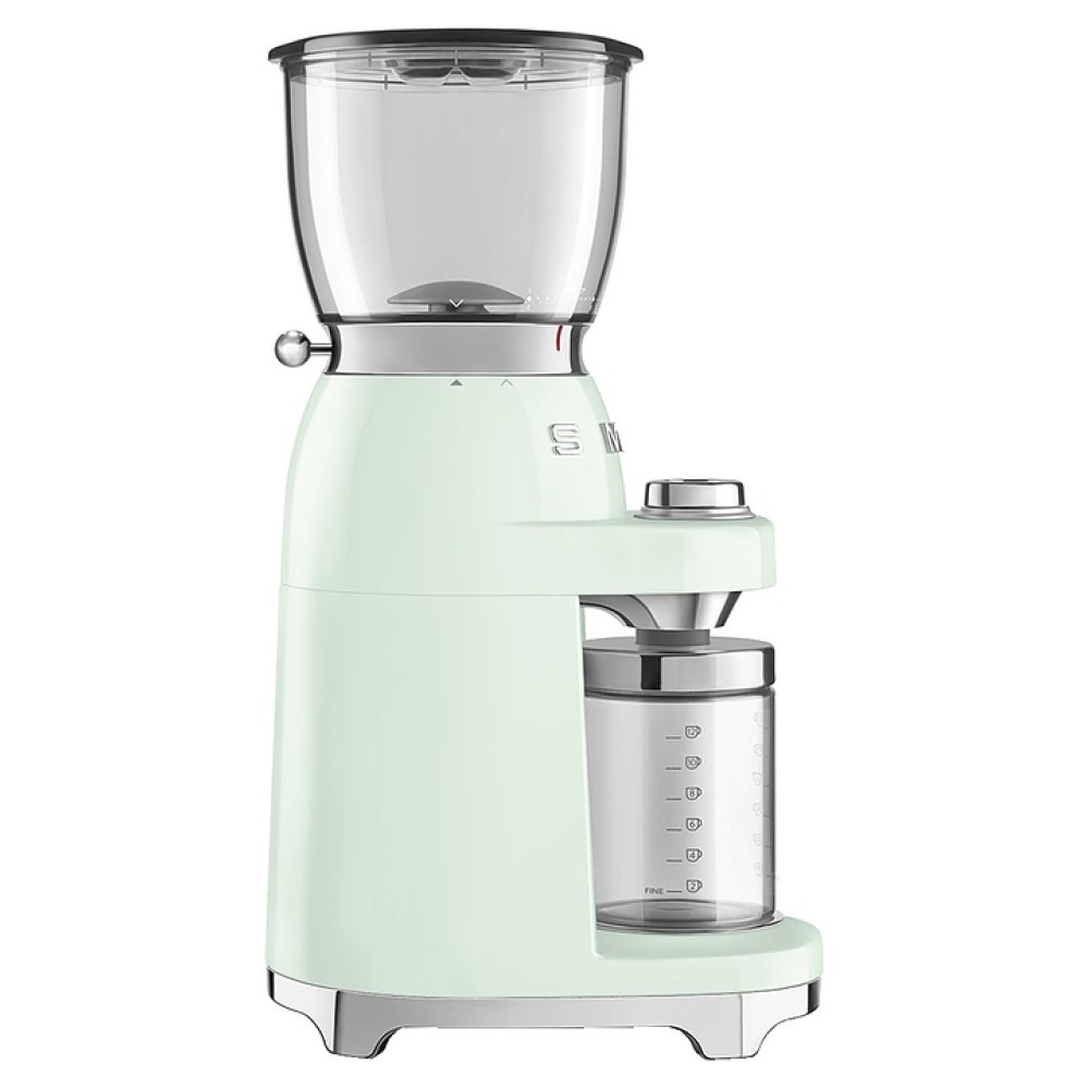 Электрическая кофемолка SMEG CGF11PGEU предназначена для приготовления молотого кофе из зерен в гостиницах, офисах и домашних условиях. Модель оснащена интегрированной подставкой для емкости с готовым продуктом, кабелем питания с вилкой и электромеханическим управлением. Корпус выполнен из нержавеющей стали с глянцевым внешним покрытием пастельного зеленого оттенка и накладными объемными серебристыми литерами логотипа, жернова – из нержавеющей стали, рукоятка рычага – из стали SUS304 с серебристой поверхностью, основание, регулировочная ручка, крышка контейнера – из пластика с хромированной поверхностью, бункер и контейнер – из высокопрочного полимера Tritan Renew без содержания токсичных компонентов, крышка бункера, подставка для холдера (держателя фильтра) и щетка – из пластика, изоляция кабеля серого цвета.