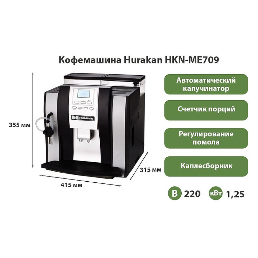 Кофемашина Hurakan HKN-ME709 используется на предприятиях общественного питания и торговли. Модель оснащена электронным управлением, защитой от перегрева, возможностью подачи горячей воды и режимом очистки от накипи.