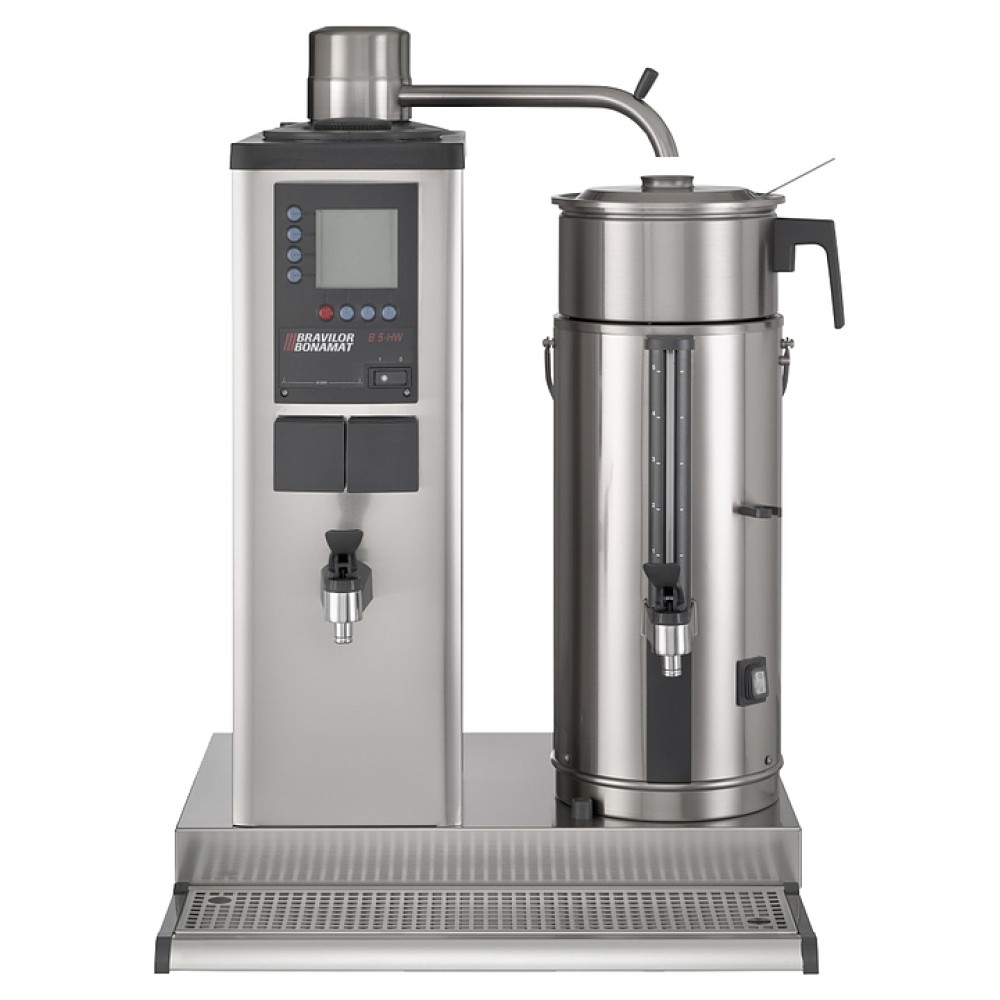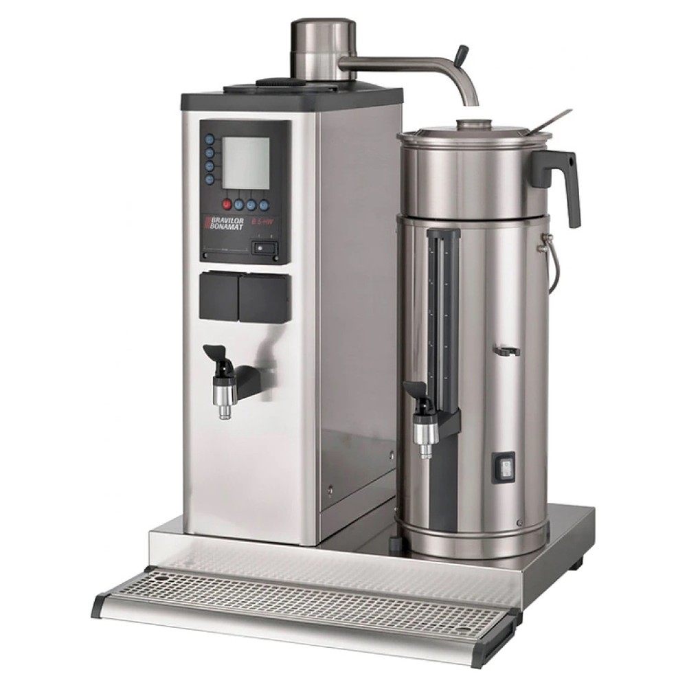 Кофеварка Bravilor Bonamat B5 HW L используется на предприятиях общественного питания и торговли для приготовления фильтрованного кофе и горячей воды, предназначенной для супа, каши, чая и других горячих напитков. Модель оснащена цифровым дисплеем, системой кофеварения, 1 емкостью для кофе слева от колонки, отдельным краном горячей воды, индикаторами заполнения, готовности кофе и удаления накипи и поддоном для капель. Корпус выполнен из нержавеющей стали.