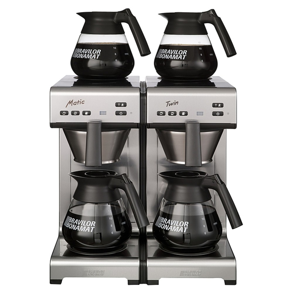 Кофеварка Bravilor Bonamat Matic Twin используется на предприятиях общественного питания и торговли для приготовления фильтрованного кофе. Модель оснащена 2 системами кофеварения, 4 саморегулируемыми плитами нагрева дна, которые поддерживают оптимальную температуру кофе, индикаторами готовности кофе и удаления накипи. Корпус выполнен из высококачественной нержавеющей стали, черные детали - из синтетических материалов.