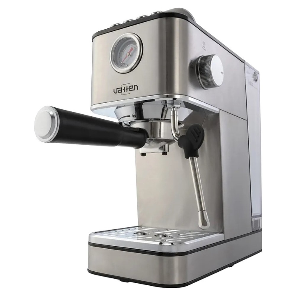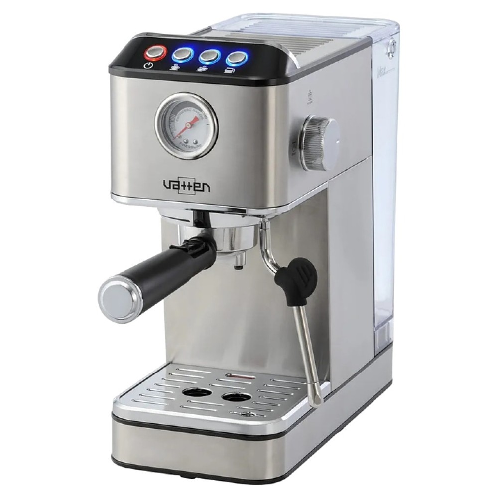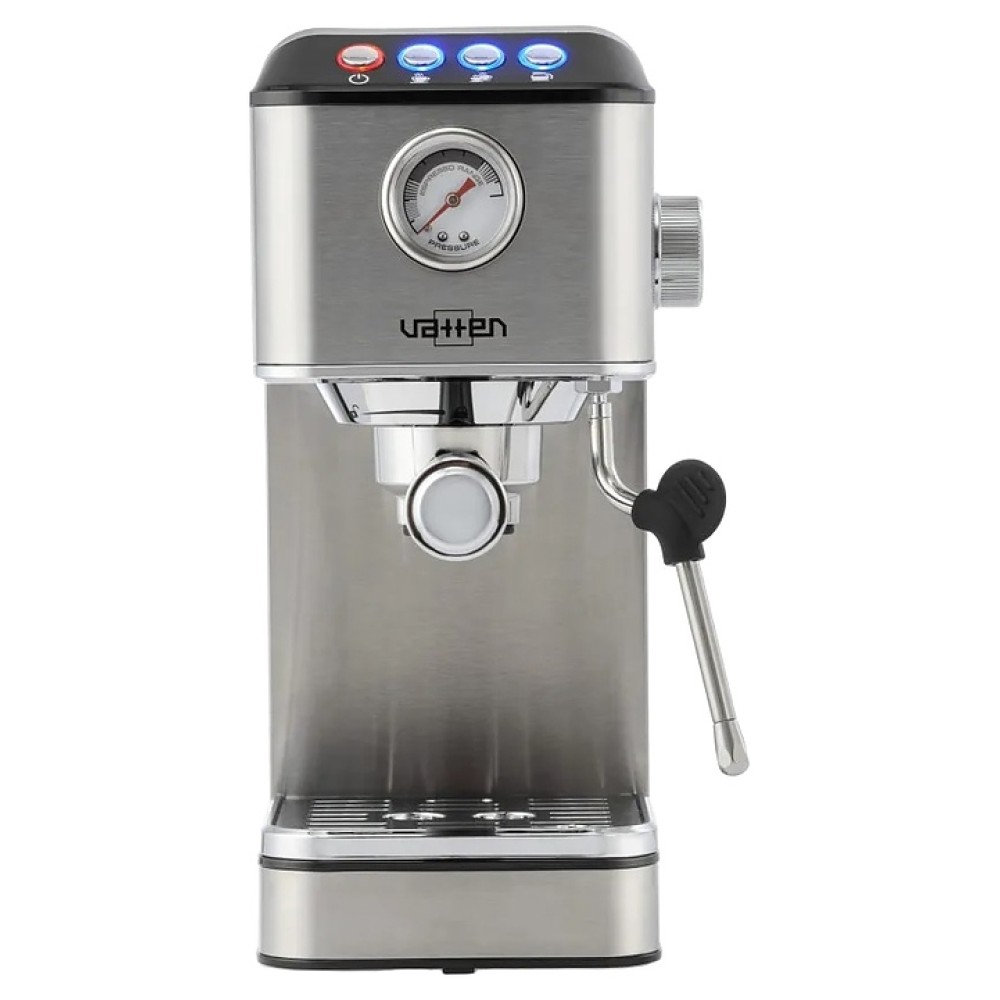 Рожковая эспрессо кофеварка Vatten VK623/1200/M используется для приготовления кофе и напитков на его основе в офисах, гостиницах и домашних условиях. Модель оснащена помпой, капучинатором в виде поворотной трубки с паровой насадкой, подставкой для чашек, кабелем питания с вилкой, электромеханической панелью управления с функциональными сенсорно-нажимными клавишами на фронтальной стенке и 3-позиционным поворотным переключателем на боковой стенке. Корпус прямоугольно ориентированной формы выполнен из нержавеющей стали с серебристой поверхностью, панель управления черного цвета.