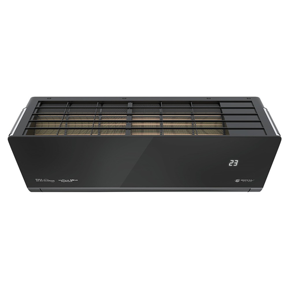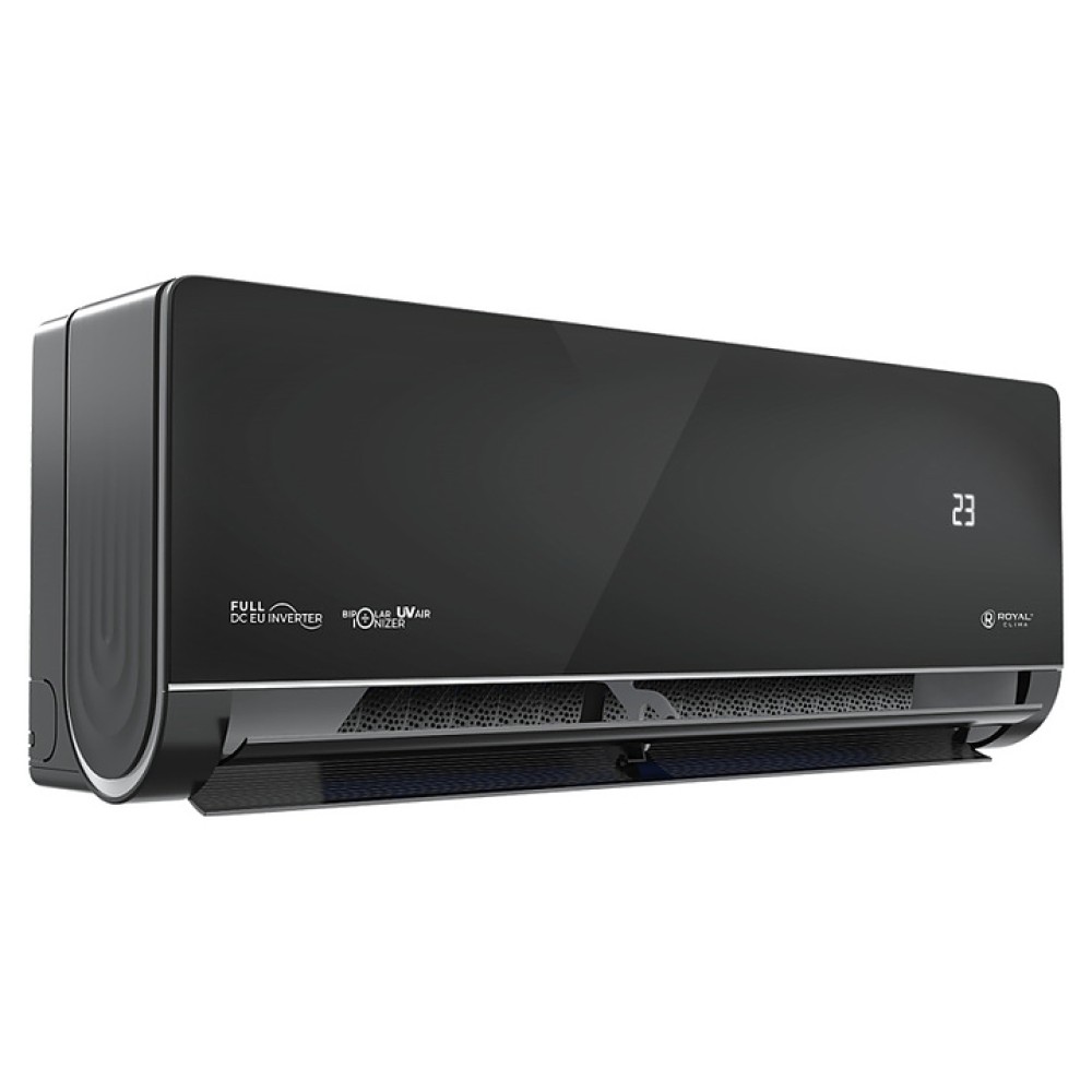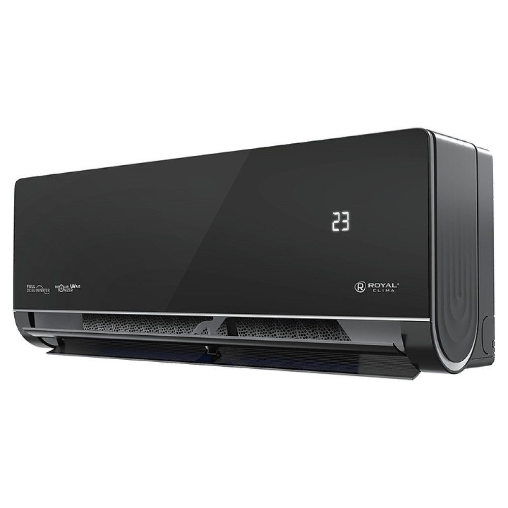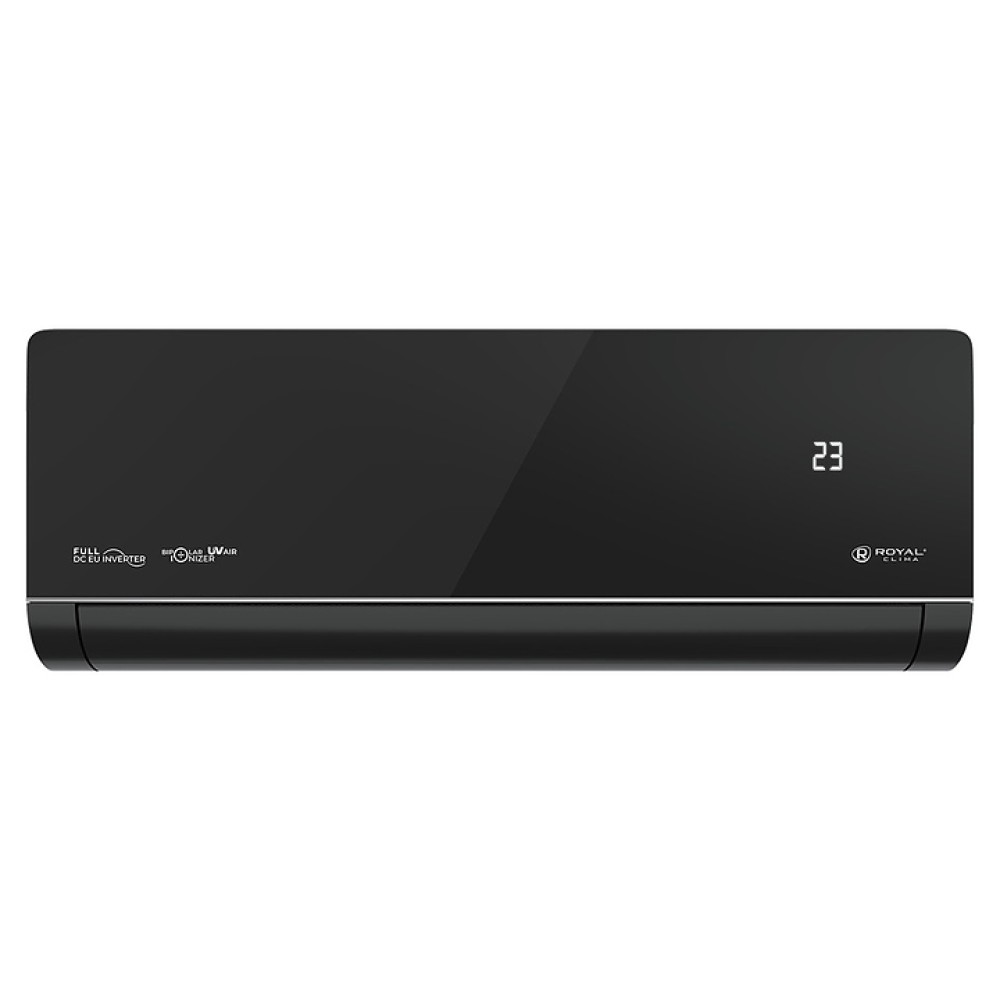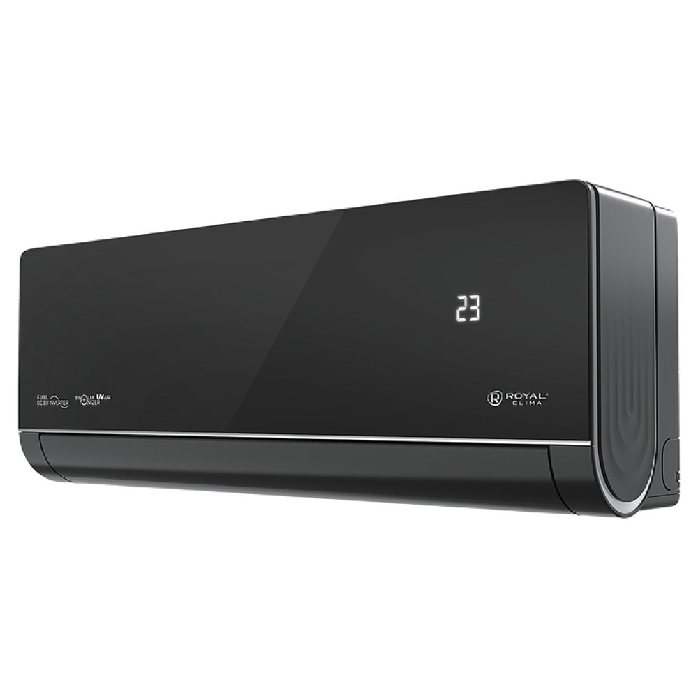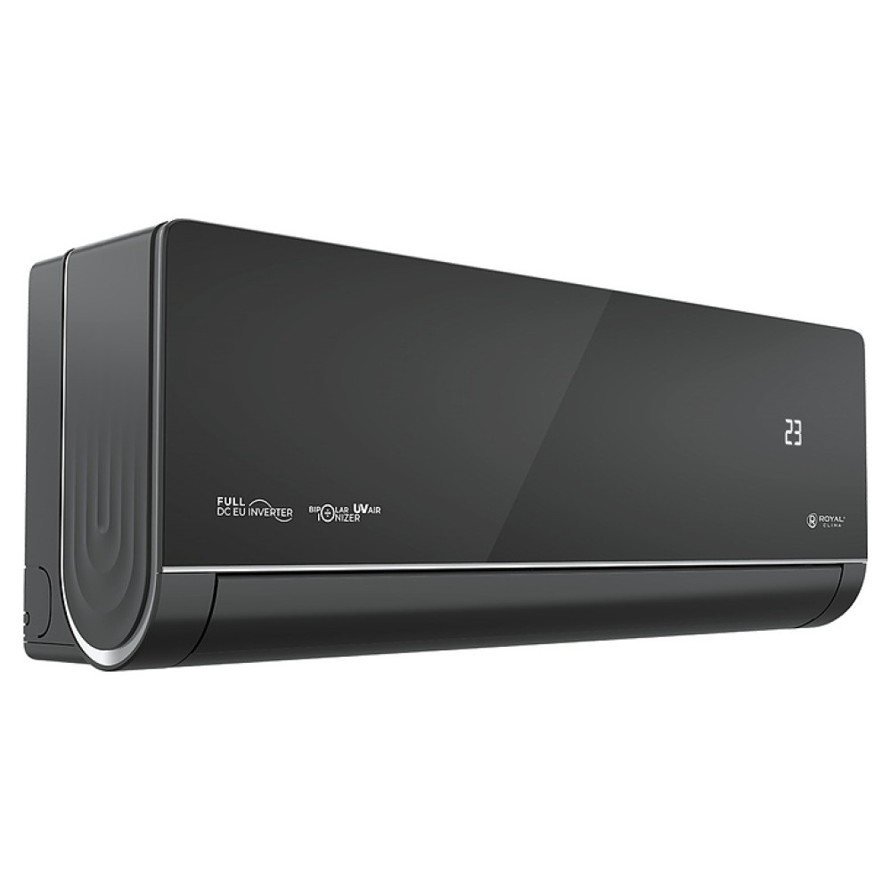 Настенная сплит-система ROYAL Clima RCI-RSN75HN серии ROYAL SUPREMO NERO Full DC EU Inverter используется для создания максимально кофмортных условий микроклимата в жилых, офисных и коммерческих помещениях. Модель состоит из внутреннего блока RCI-RSN75HN/IN и наружного блока RCI-RSN75HN/OUT. Наружный блок оснащен 3-лопастным вентилятором, защитными решеткой и крышкой для сервисных вентилей, внутренний блок – воздухозаборной решеткой, откидной лицевой панелью, подвижными горизонтальными и вертикальными жалюзи, электронным блоком управления и светодиодным дисплеем скрытого типа с проецируемой на фронтальную панель индикацией, пульт – информативным жидкокристаллическим дисплеем с яркой оранжевой подсветкой и кнопочной клавиатурой. Облицовка внутреннего блока выполнена из пластика с поверхностью черного цвета и декоративными фронтальными и боковыми вставками серебристого оттенка, корпус пульта – из ударопрочного черного пластика.