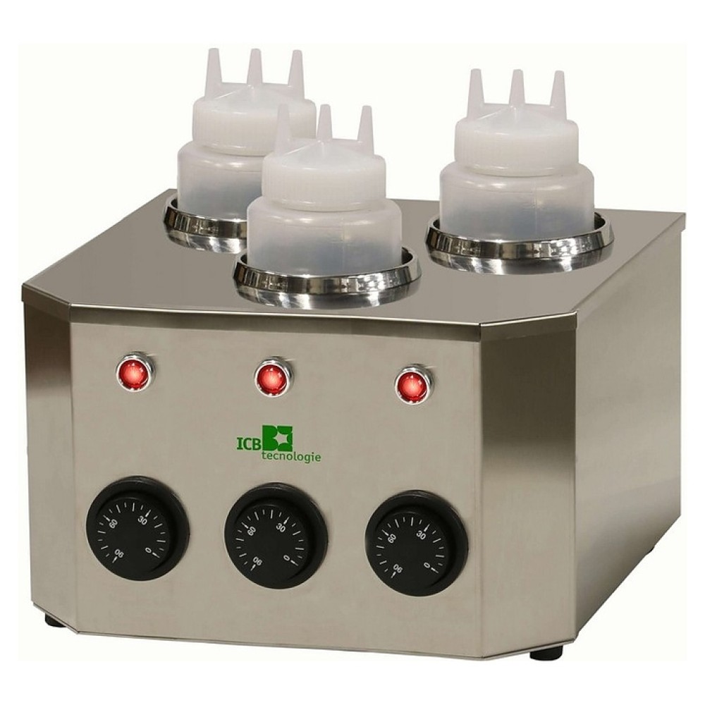 Подогреватель топпинга ICB tecnologie s.r.l. 09.WS3 предназначен для поддержания в теплом состоянии и разогрева топпингов и соусов на предприятиях общественного питания и торговли. Модель оснащена аналоговыми термостатами и тремя бутылками. Корпус выполнен из нержавеющей стали, бутылки - из пластика.