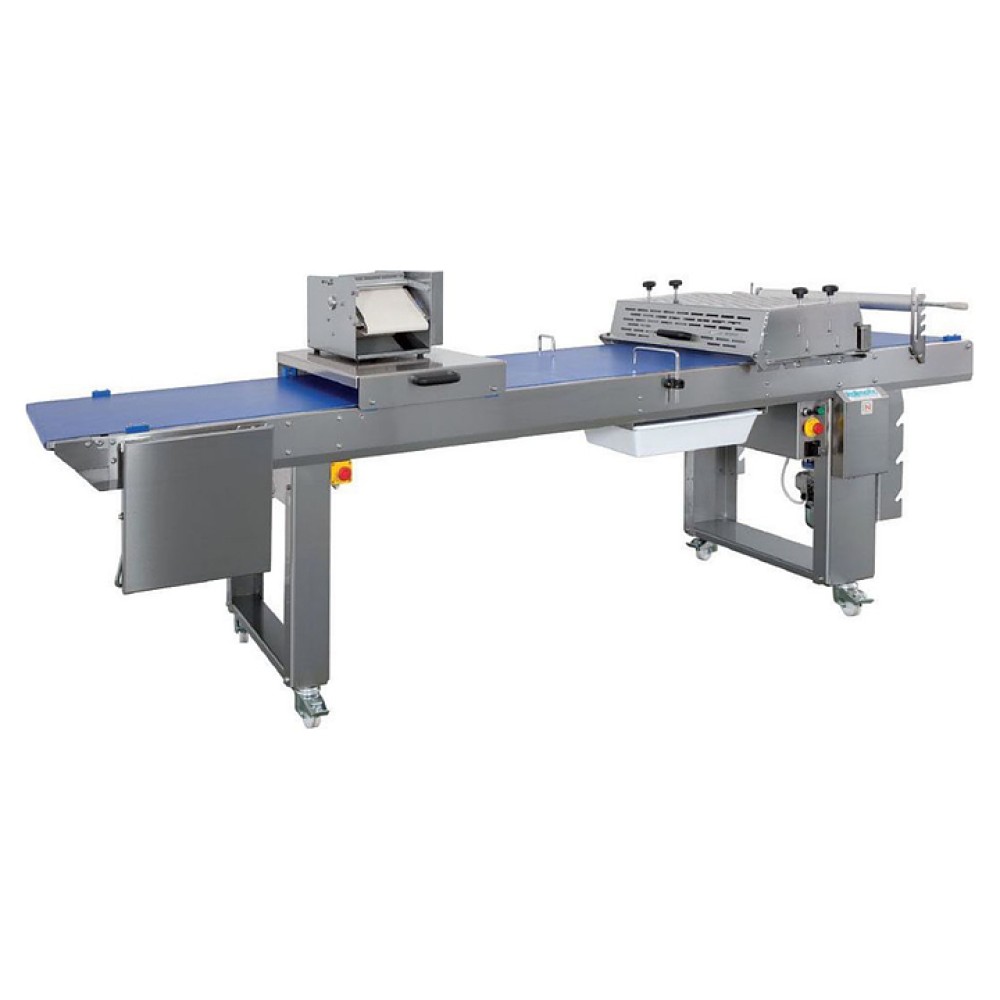 Рабочий стол Rollmatic TB30 с дозатором COMBI LINE предназначен для нарезки полотна слоеного теста, предварительно намотанного на скалку, на заготовки треугольной, квадратной, прямоугольной, круглой или овальной форм и дозирования в них начинки для последующего ручного формования кондитерских изделий в пекарнях, кондитерских, на предприятиях пищевой промышленности и общественного питания. Модель оснащена системой резки и встроенными электрическими розетками для подключения к комплектующему оборудованию. Корпус и рабочий стол выполнены из нержавеющей стали, дозатор - из нержавеющей стали AISI 316.