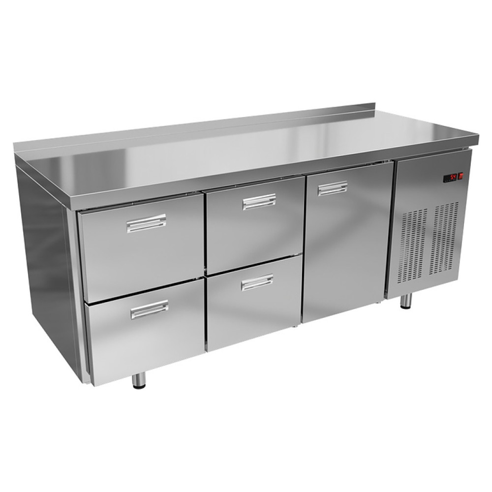 Холодильный стол KRONER СХб 1/4я-180-70 предназначен для хранения предварительно охлажденных пищевых продуктов и обработки ингредиентов в процессе приготовления блюд. Модель оснащена встроенным компрессорным холодильным агрегатом с боковым расположением, столешницей c задним бортом, электронной панелью управления и холодильной камерой с 3 секциями: 2 с 2 выдвижными ящиками в каждой и 1 с распашной дверью. Корпус и столешница выполнены из шлифованной нержавеющей стали, задняя стенка – из оцинкованной стали.