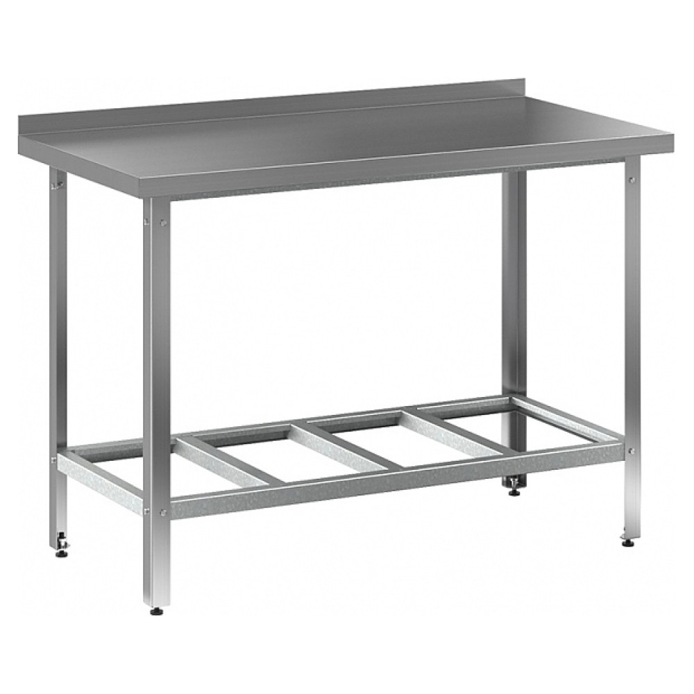 Производственный стол KRONER СПЭ 1200/600 серии Эконом используется на предприятиях общественного питания и торговли для разделки и обработки пищевых продуктов, а также для расстановки посуды и кухонного инвентаря. Модель оснащена столешницей с усилением, разборным каркасом из уголка, бортом, полкой-решеткой и регулируемыми по высоте ножками. Столешница выполнена из нержавеющей стали AISI 430, каркас и полка-решетка - из оцинкованной стали, усиление столешницы - из ЛДСП, опоры - из пластика.