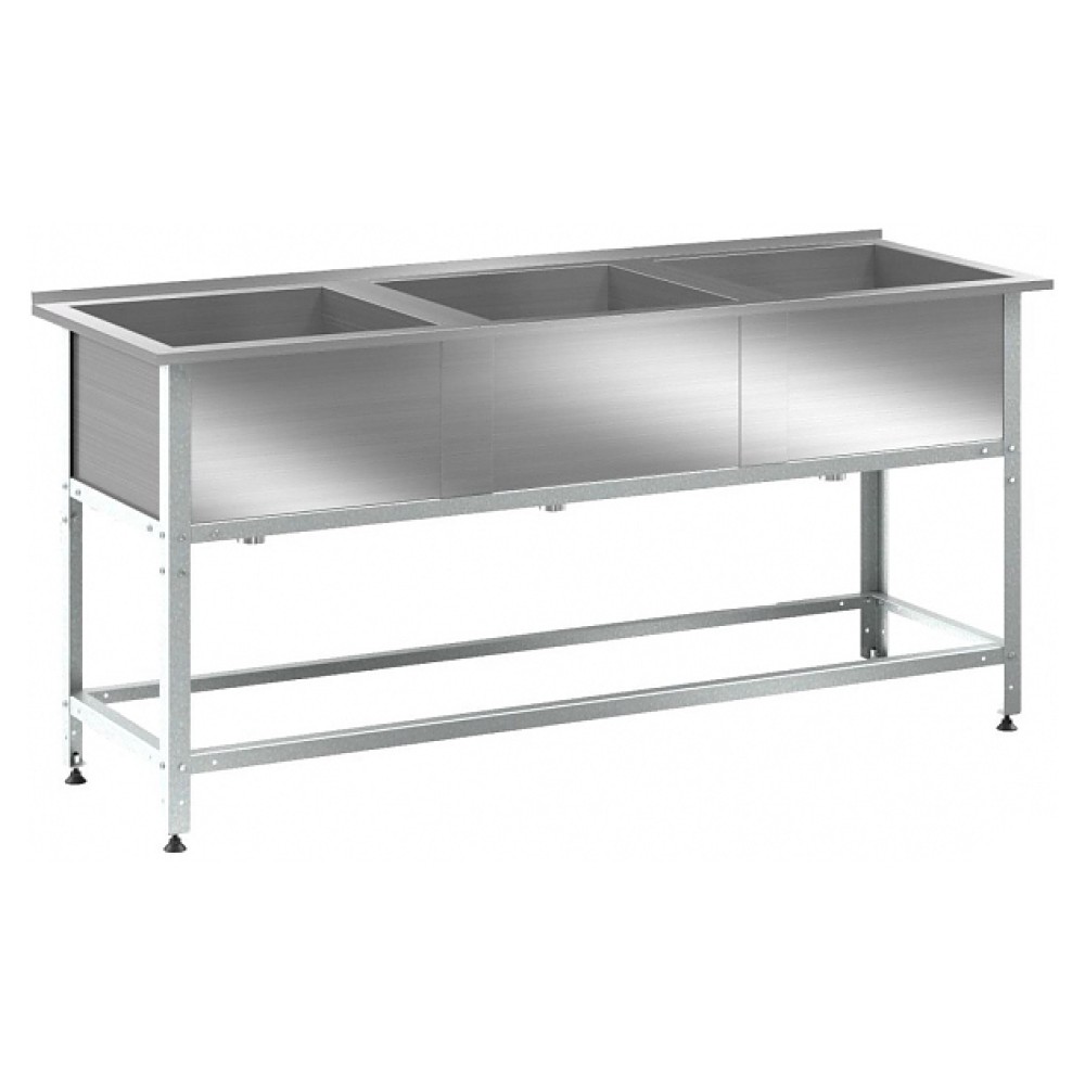 Моечная ванна KRONER ВМЭ-3/600 Б серии Эконом предназначена для мытья, дезинфекции и ополаскивания использованной посуды на предприятиях общественного питания. Модель оснащена 3 сварными мойками, 3 сливами, бортом, разборным каркасом из уголка и нижней обвязкой с 4-х сторон. Регулируемые по высоте опоры компенсируют неровности пола. Мойки выполнены из нержавеющей стали AISI 430, каркас и обвязка - из оцинкованной стали, опоры - из пластика.