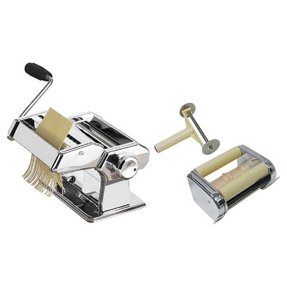В комплект поставки входят съёмные насадки: тальолини 2 мм, феттучине 6,25 мм и равиоли (2 в ряд, размер 45х45 мм).