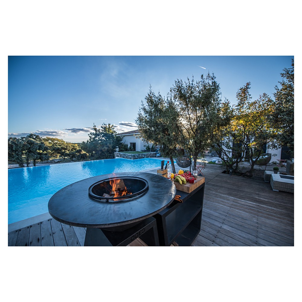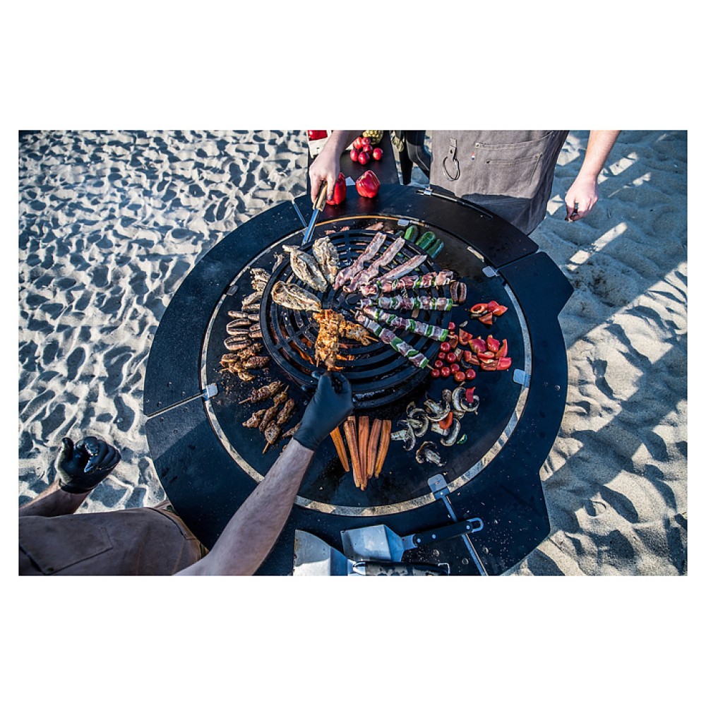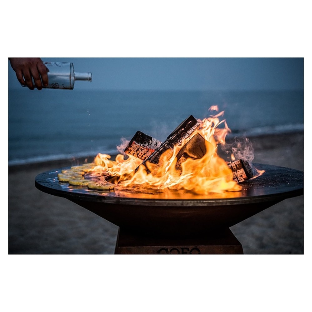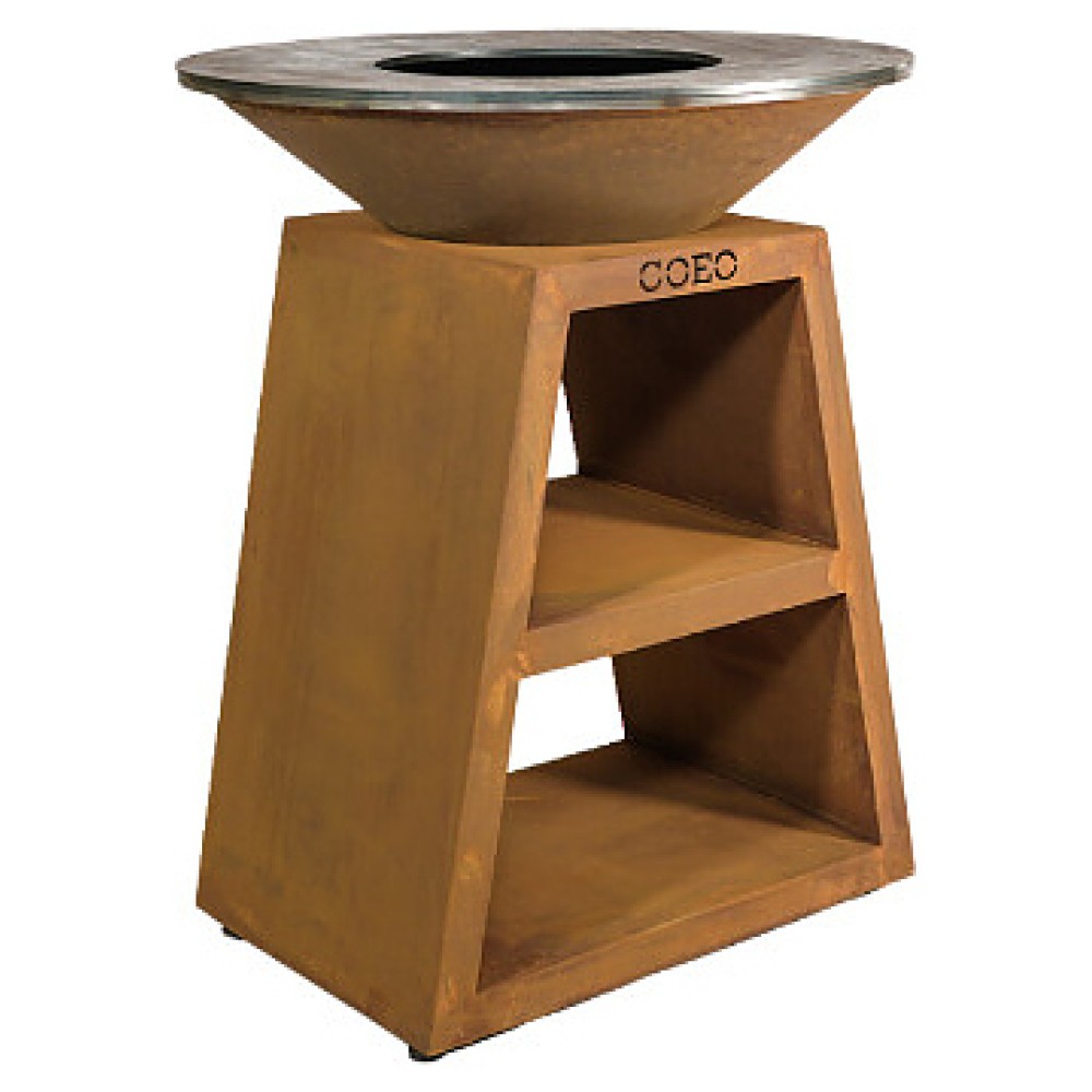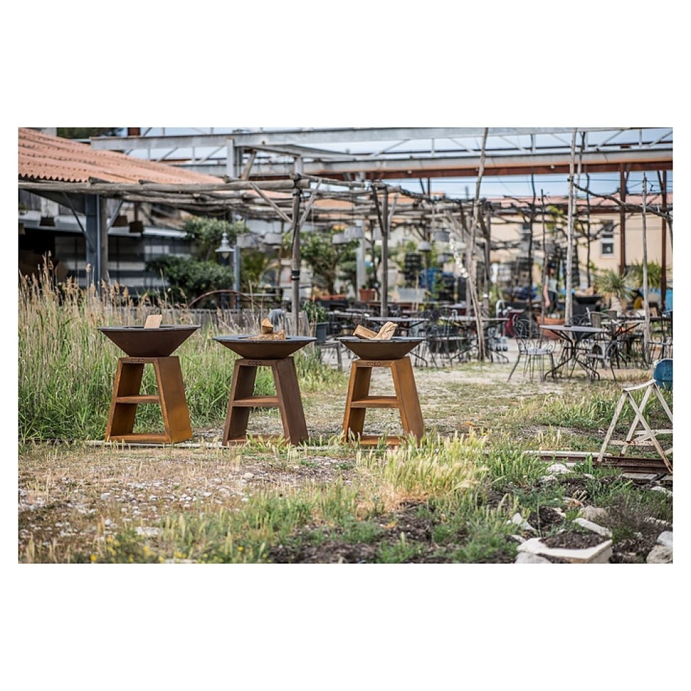 Уличный гриль COEO TRIO 82 серии Brasero используется на уличных площадках баров, кафе, других небольших предприятий общественного питания, кемпингов, частных домов и дач для жарки овощей, рыбы, приготовления шашлыка, а также различных тушеных блюд в чугунной посуде. Модель оснащена трапецевидной подставкой, конически расширенным кверху очагом и съемной круглой планчой с расположенной под небольшим наклоном к широкому отверстию в центре рабочей поверхностью. Подставка и очаг выполнены из высококачественной устойчивой к атмосферным воздействиям кортеновской стали (Corten) с характерной ржавой поверхностью, планча – из безопасной для пищевой продукции толстостенной стали с серебристой поверхностью.