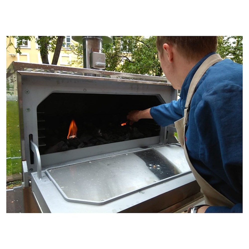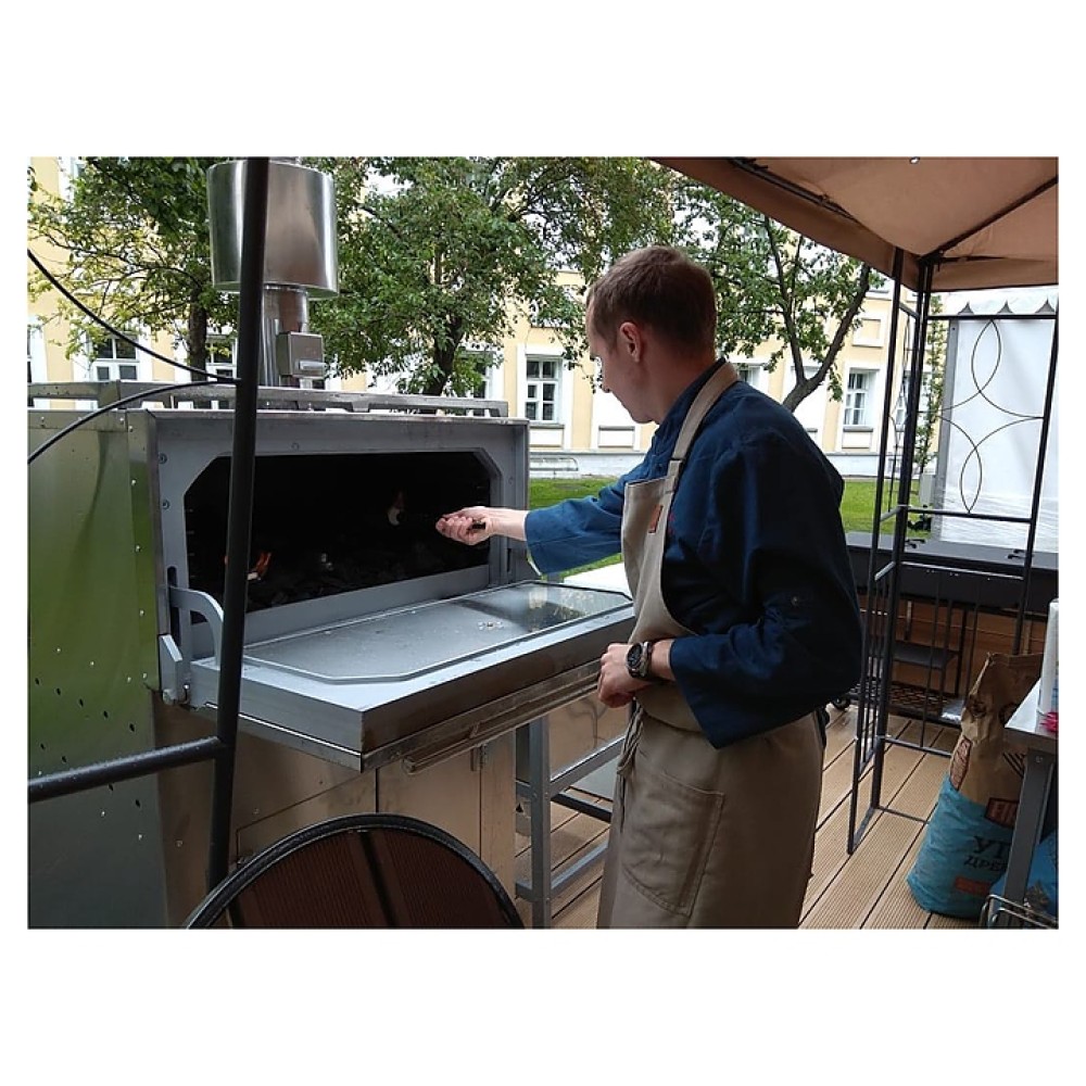 В комплект поставки входят шкаф-подставка, искрогаситель, жаропрочная гриль-решетка, верхняя полка-решетка для готовых продуктов и ведро для золы.