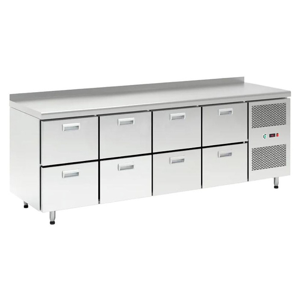 Холодильный стол LARK GN 2222/TN используется на предприятиях общественного питания и торговли для кратковременного хранения предварительно охлажденных мясных и рыбных продуктов и полуфабрикатов, а также для раскатывания теста и обработки ингредиентов на рабочей поверхности. Цельнозаливной корпус обеспечивает высокую герметичность и жёсткость конструкции. Модель оснащена 8 ящиками, расположенным сбоку агрегатным отсеком, столешницей с бортом и регулируемыми по высоте ножками. Корпус и столешница выполнены из нержавеющей стали.
