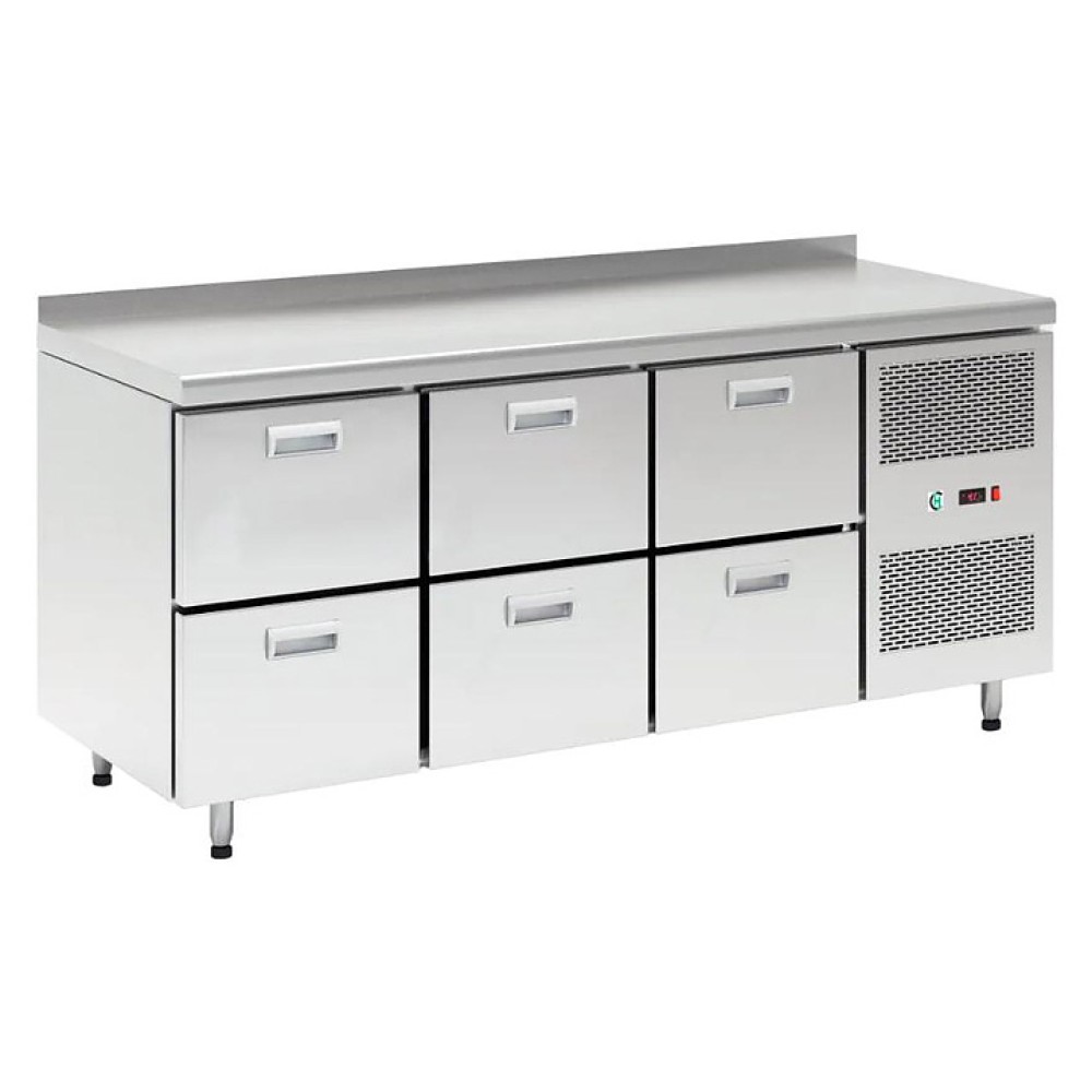 Холодильный стол LARK SN 222/TN используется на предприятиях общественного питания и торговли для кратковременного хранения предварительно охлажденных мясных и рыбных продуктов и полуфабрикатов, а также для раскатывания теста и обработки ингредиентов на рабочей поверхности. Цельнозаливной корпус обеспечивает высокую герметичность и жёсткость конструкции. Модель оснащена 6 ящиками, расположенным сбоку агрегатным отсеком, столешницей с бортом и регулируемыми по высоте ножками. Корпус и столешница выполнены из нержавеющей стали.